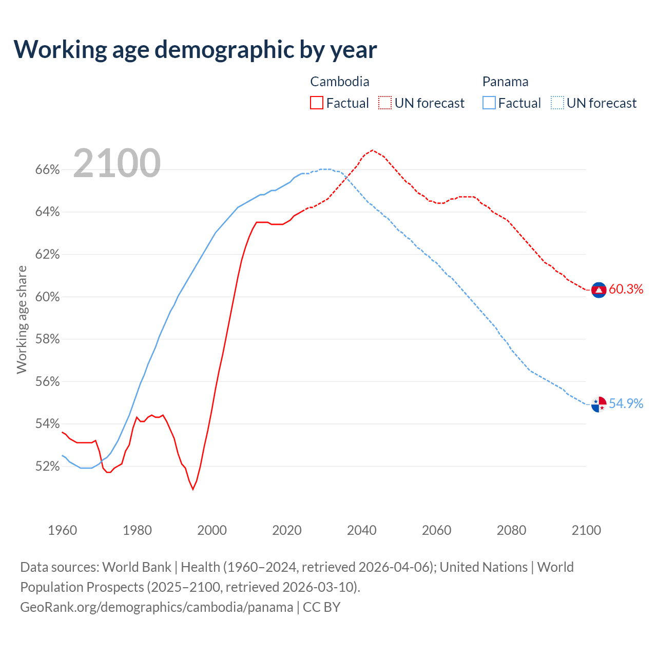 - Cambodia has 11.6M working age adults (aged 15-64) vs 3.05M in Panama.