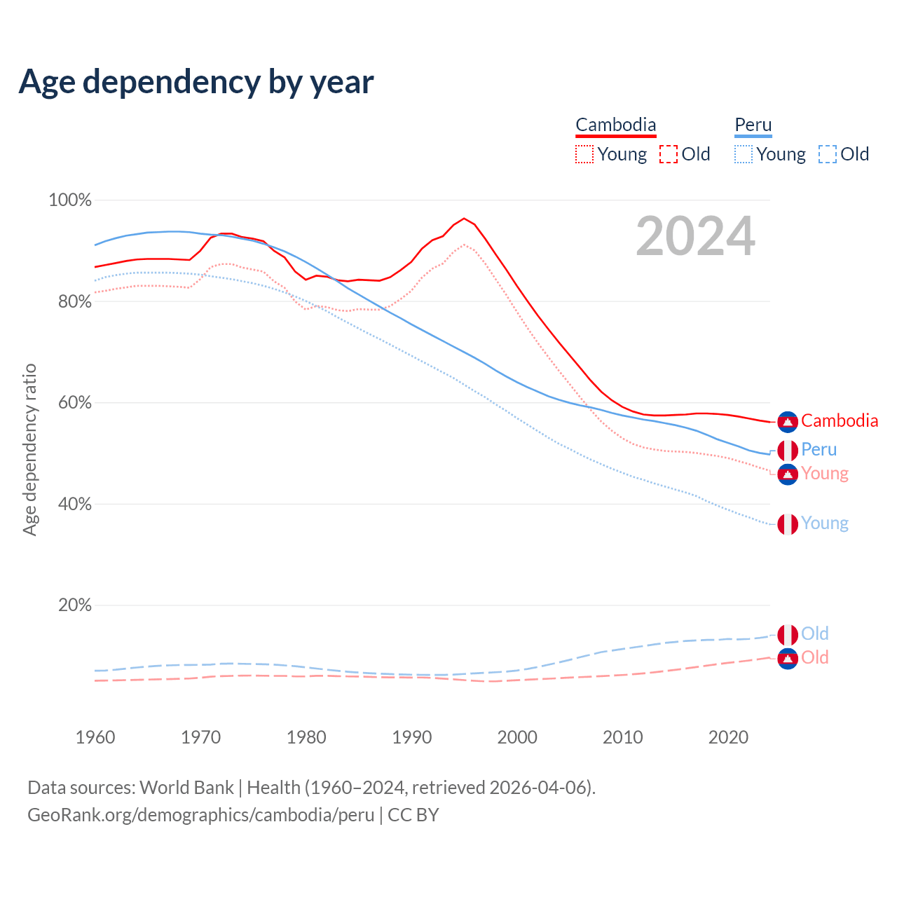 - Cambodia is ranked 121/196 by median age (oldest to youngest) vs 97/196 for Peru.