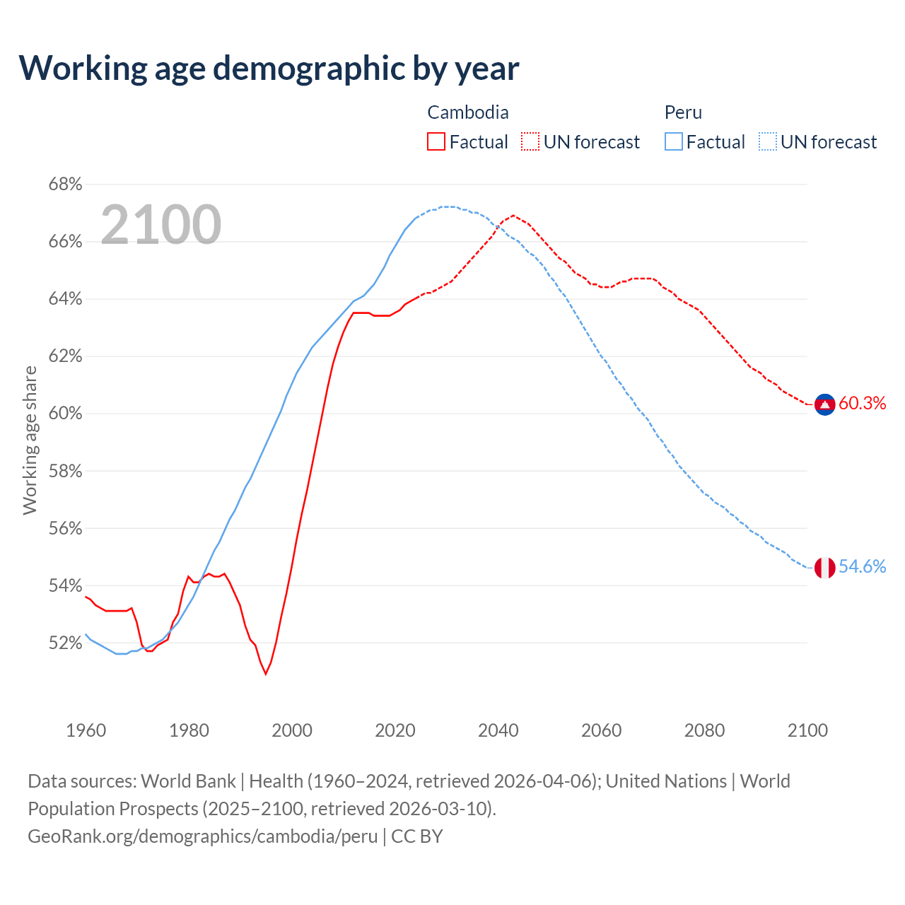 - Cambodia has 11.6M working age adults (aged 15-64) vs 23.4M in Peru.