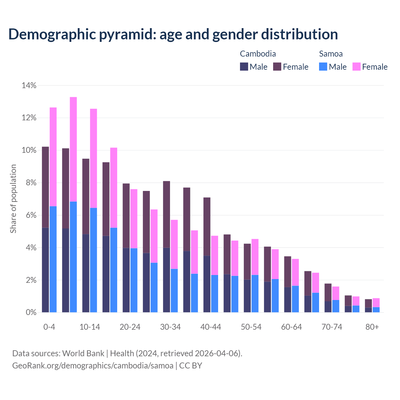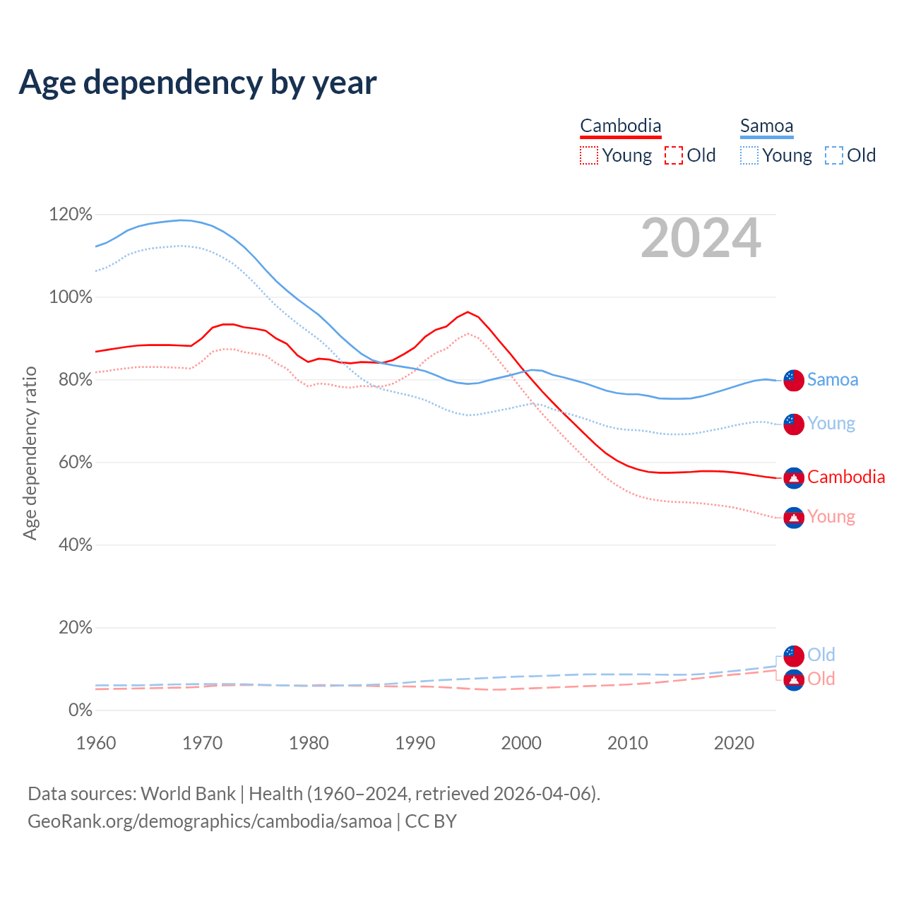 - Cambodia is ranked 121/196 by median age (oldest to youngest) vs 158/196 for Samoa.