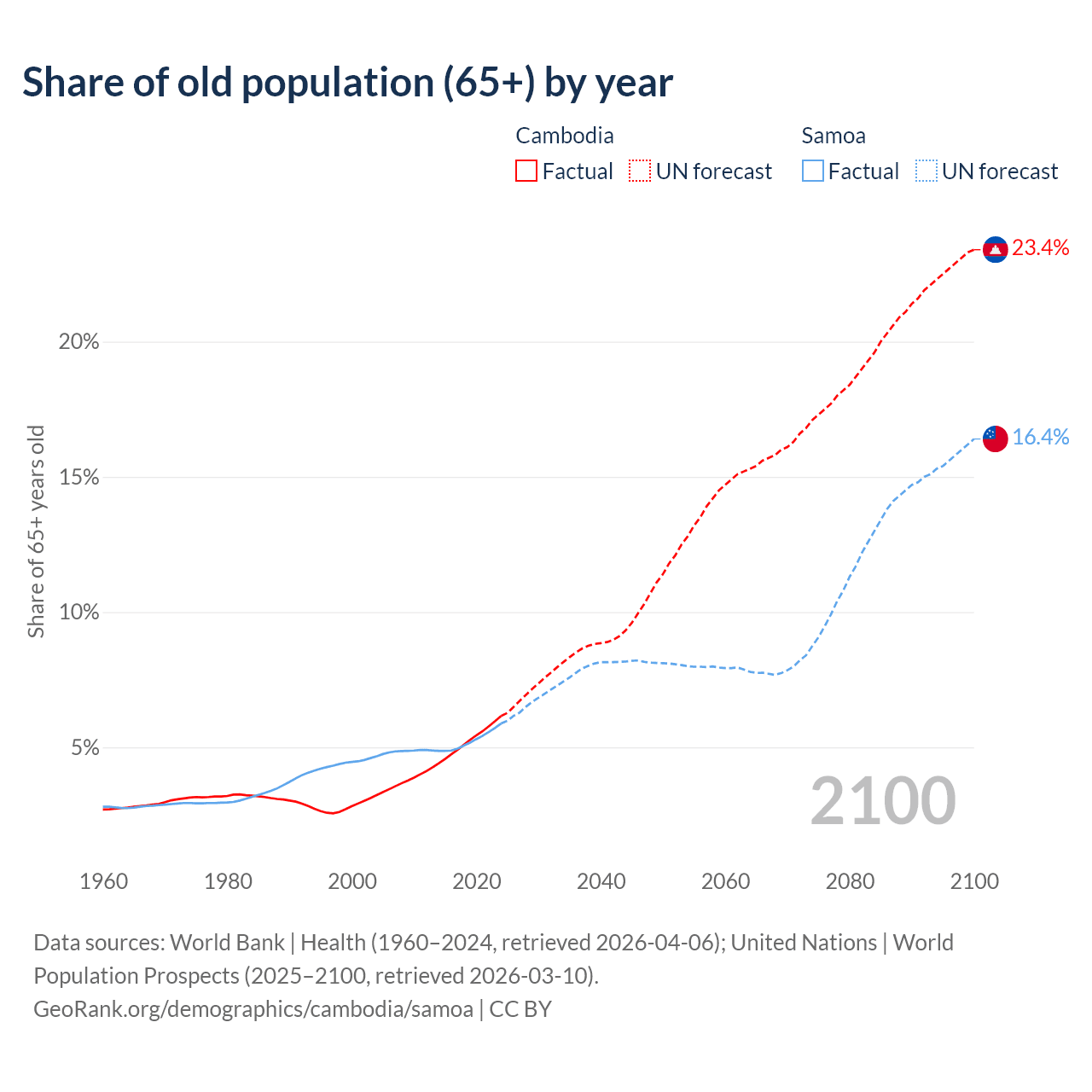 - The share of old-age demographic (65+) in Cambodia is 6.16% vs 5.88% in Samoa.