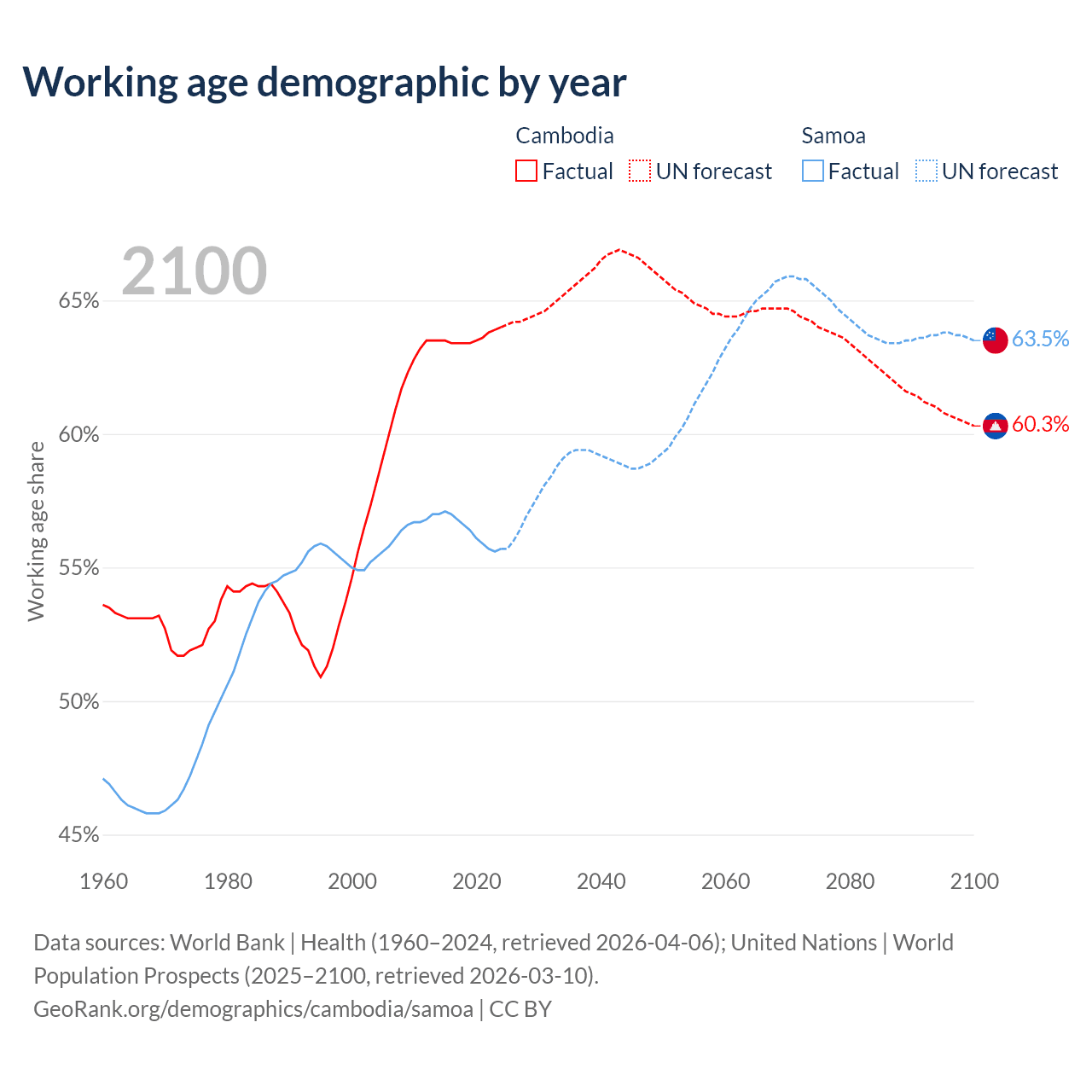 - As of 2026, the population of Cambodia is 18.1M vs 221K in Samoa - 82 times difference.