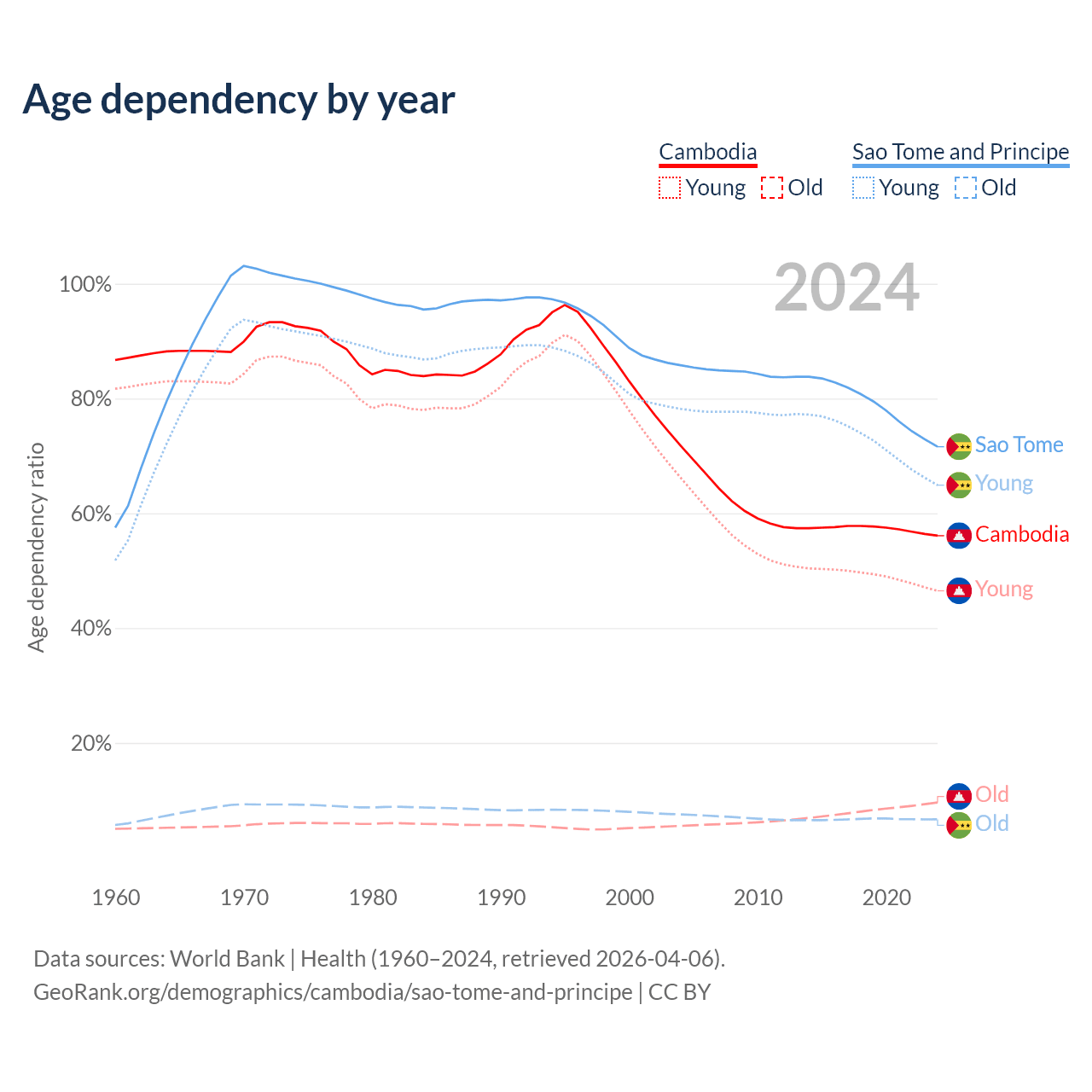 - Cambodia is ranked 121/196 by median age (oldest to youngest) vs 163/196 for Sao Tome and Principe.