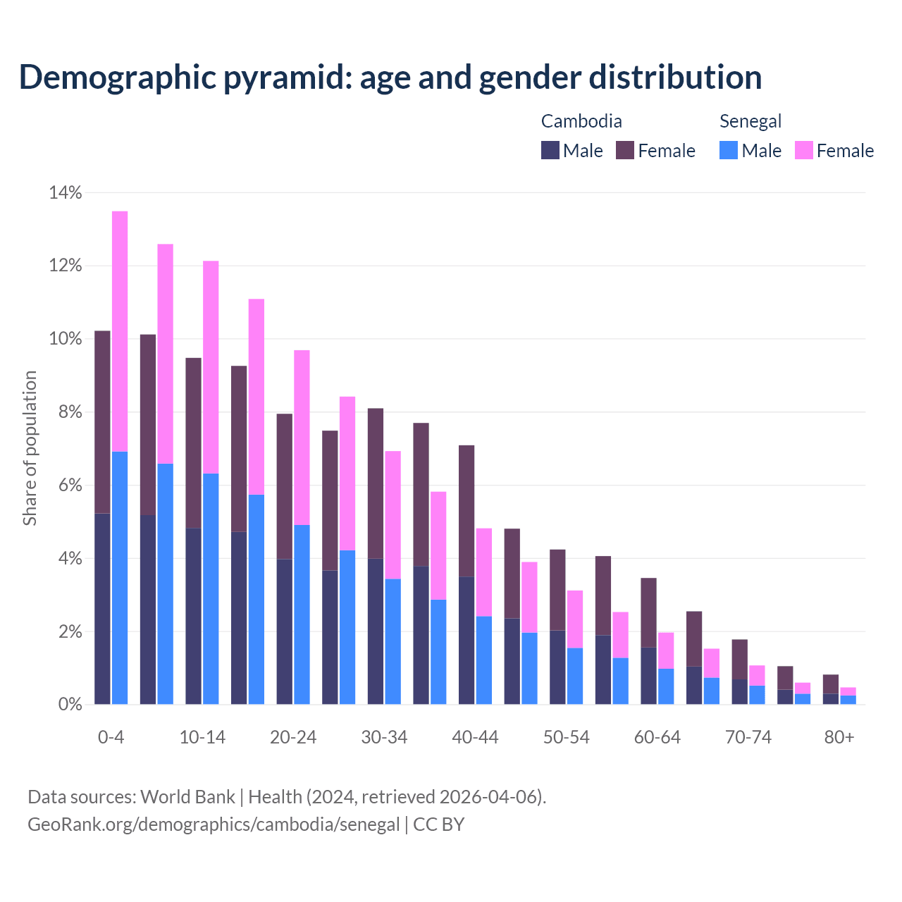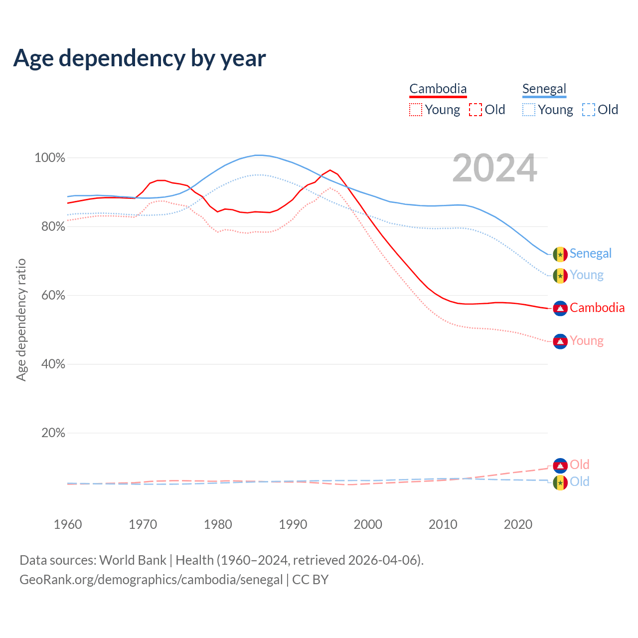 - Cambodia is ranked 121/196 by median age (oldest to youngest) vs 162/196 for Senegal.