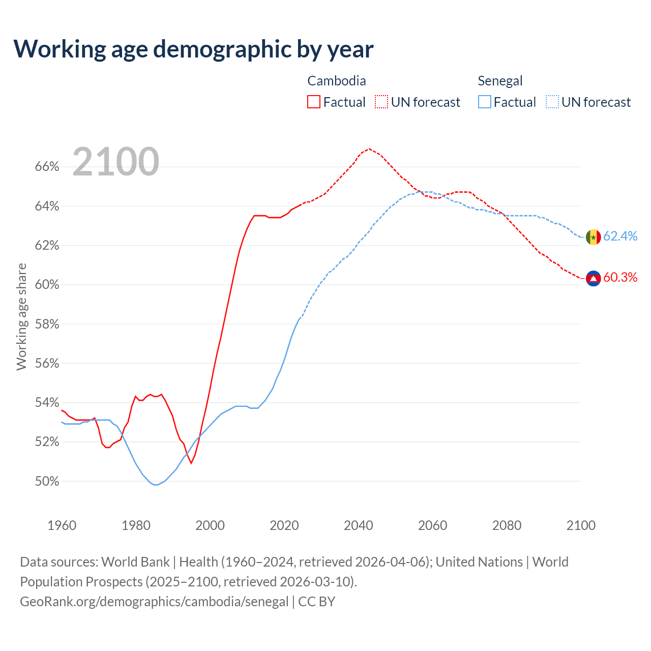 - Cambodia has 11.6M working age adults (aged 15-64) vs 11.3M in Senegal.