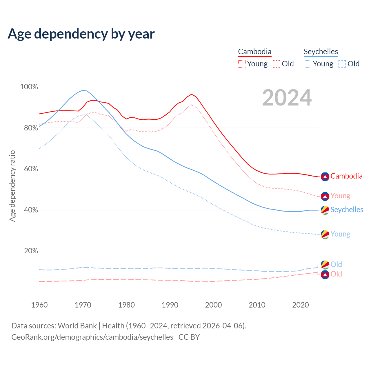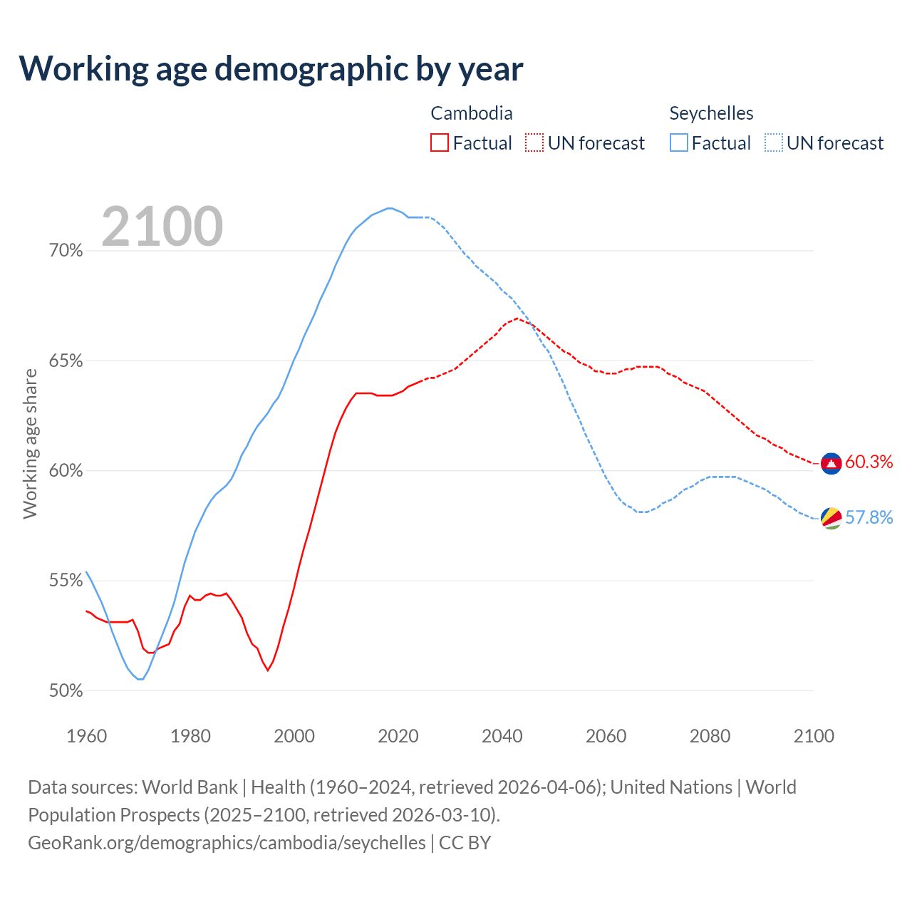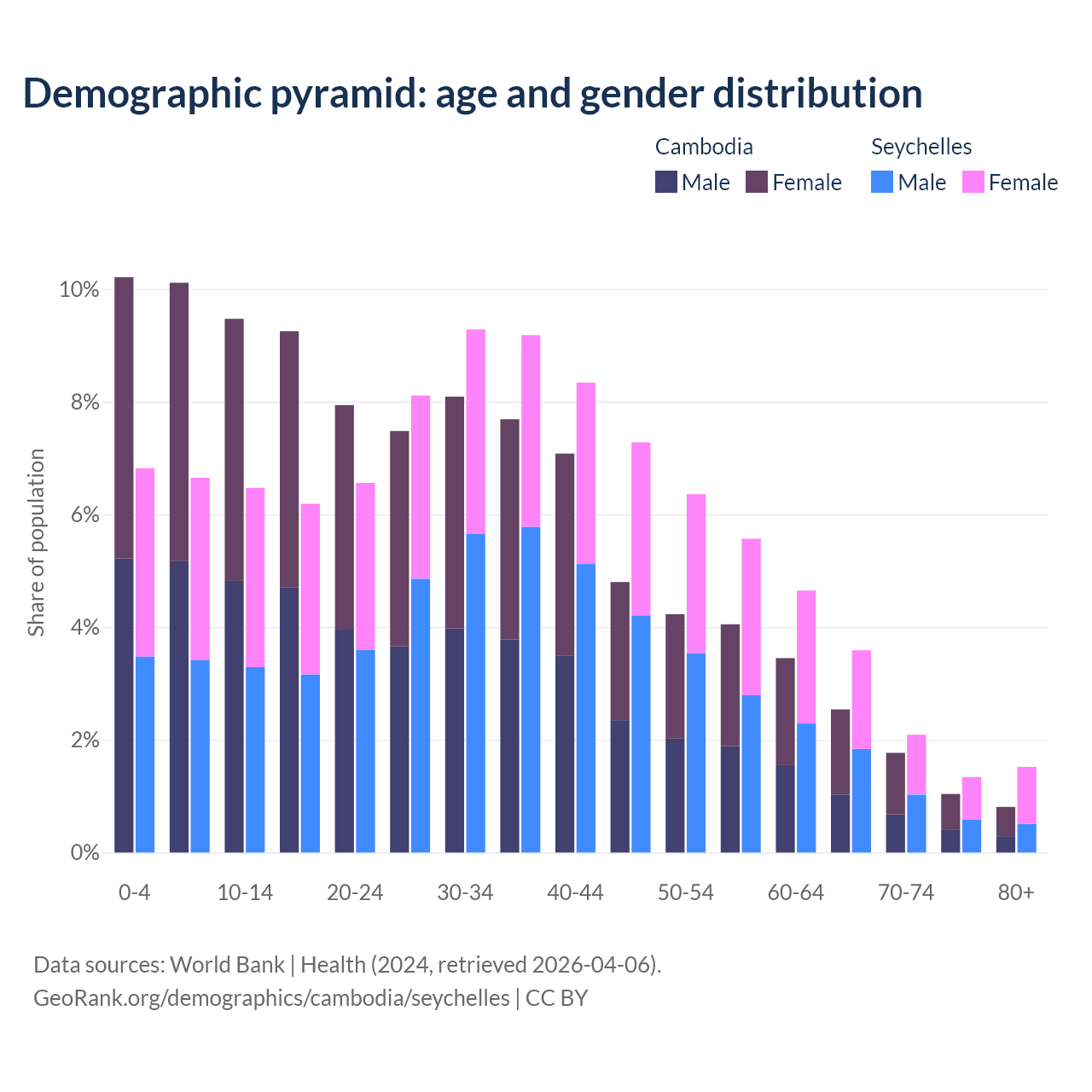 The share of older people aged 65 and over is 6.16% in Cambodia and 8.54% in the Seychelles. Life expectancy in Cambodia compared to the Seychelles .