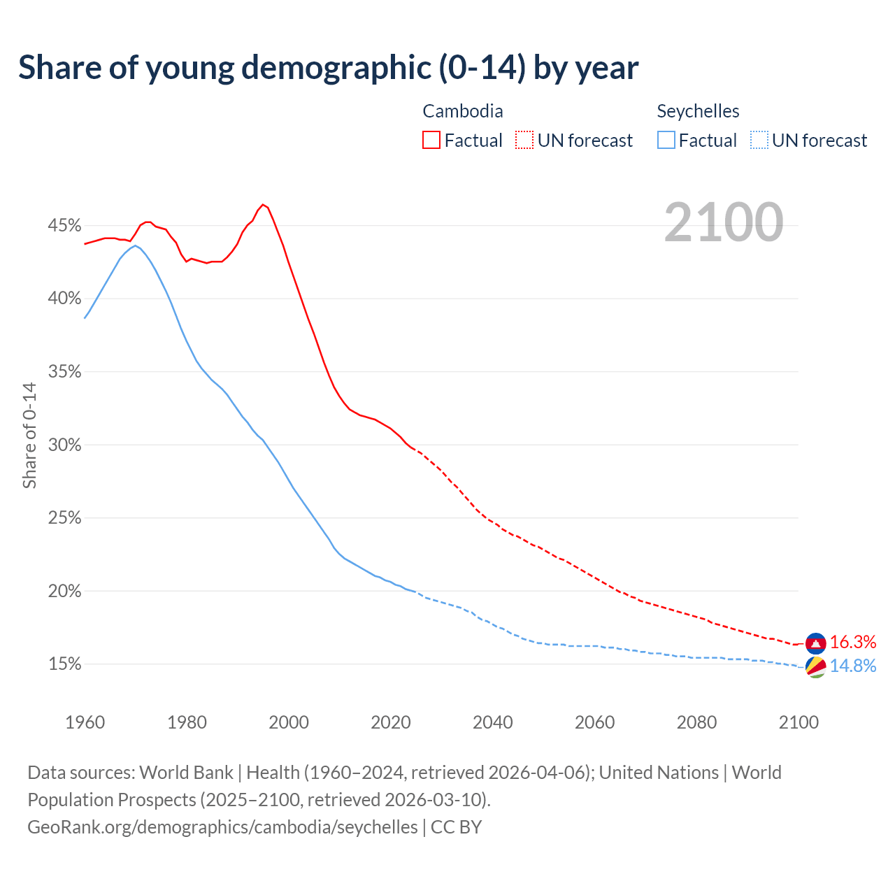 - The share of young demographic (0-15 years old) in Cambodia is 29.8% vs 20% in the Seychelles.