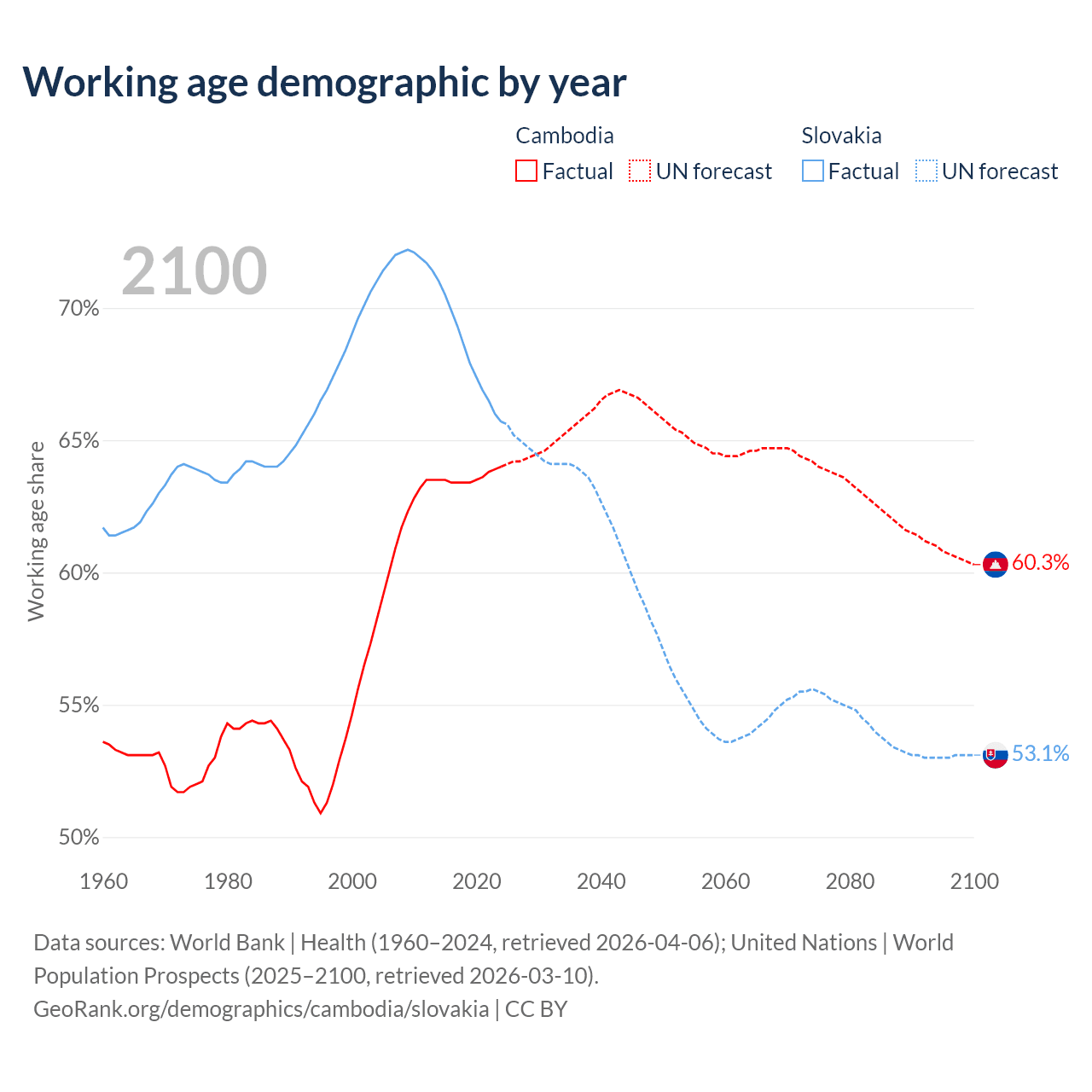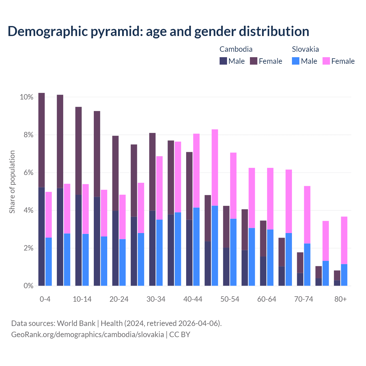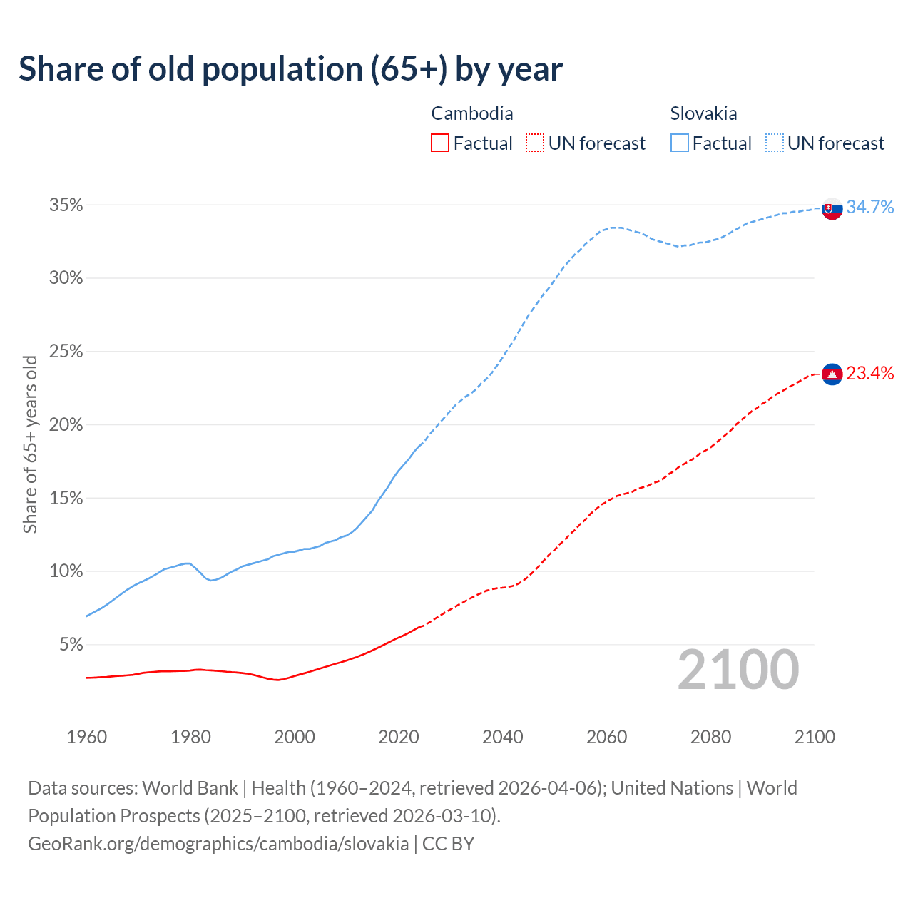 The share of older people aged 65 and over is 6.16% in Cambodia and 18.5% in Slovakia. Life expectancy in Cambodia compared to Slovakia .