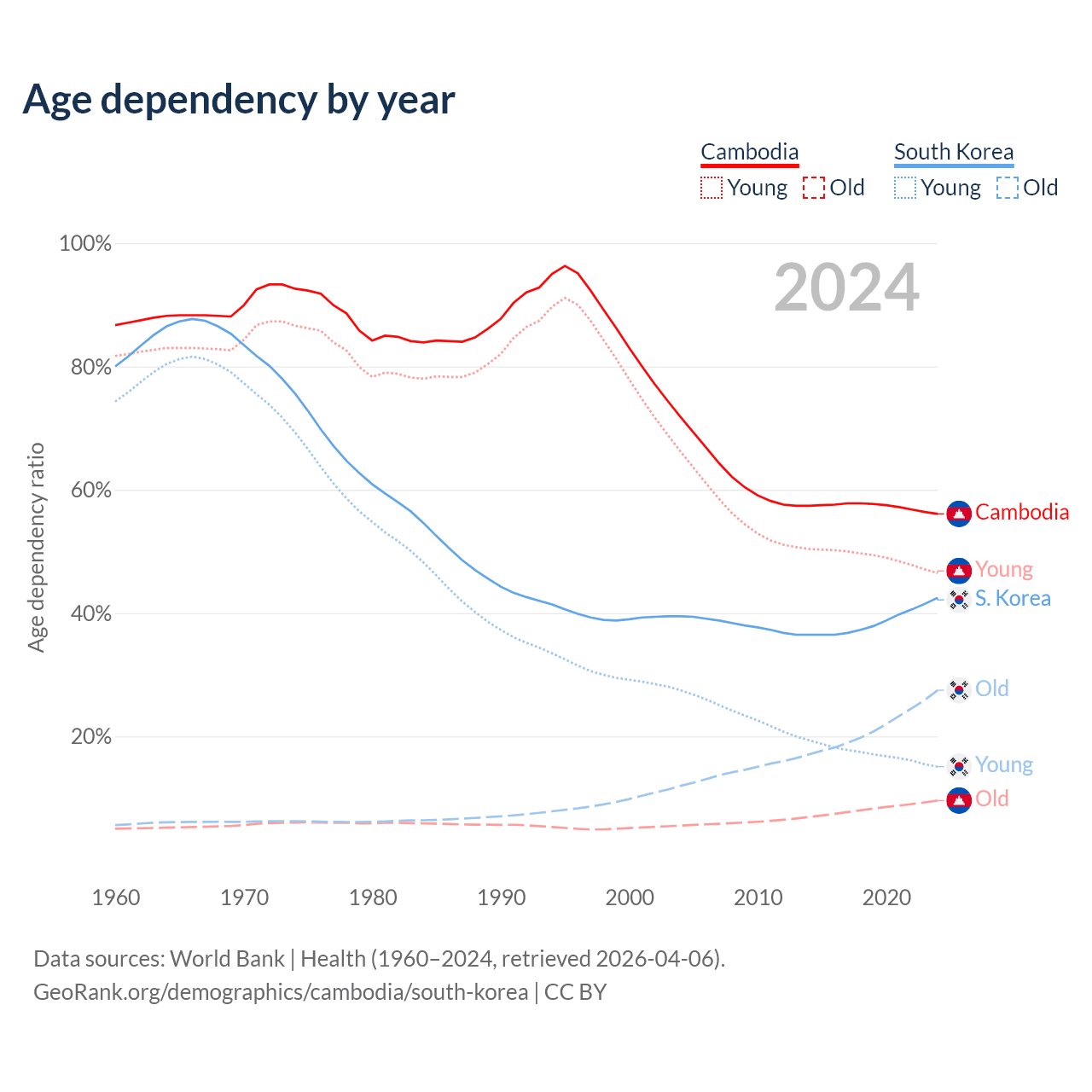 - Cambodia is ranked 121/196 by median age (oldest to youngest) vs 10/196 for South Korea.