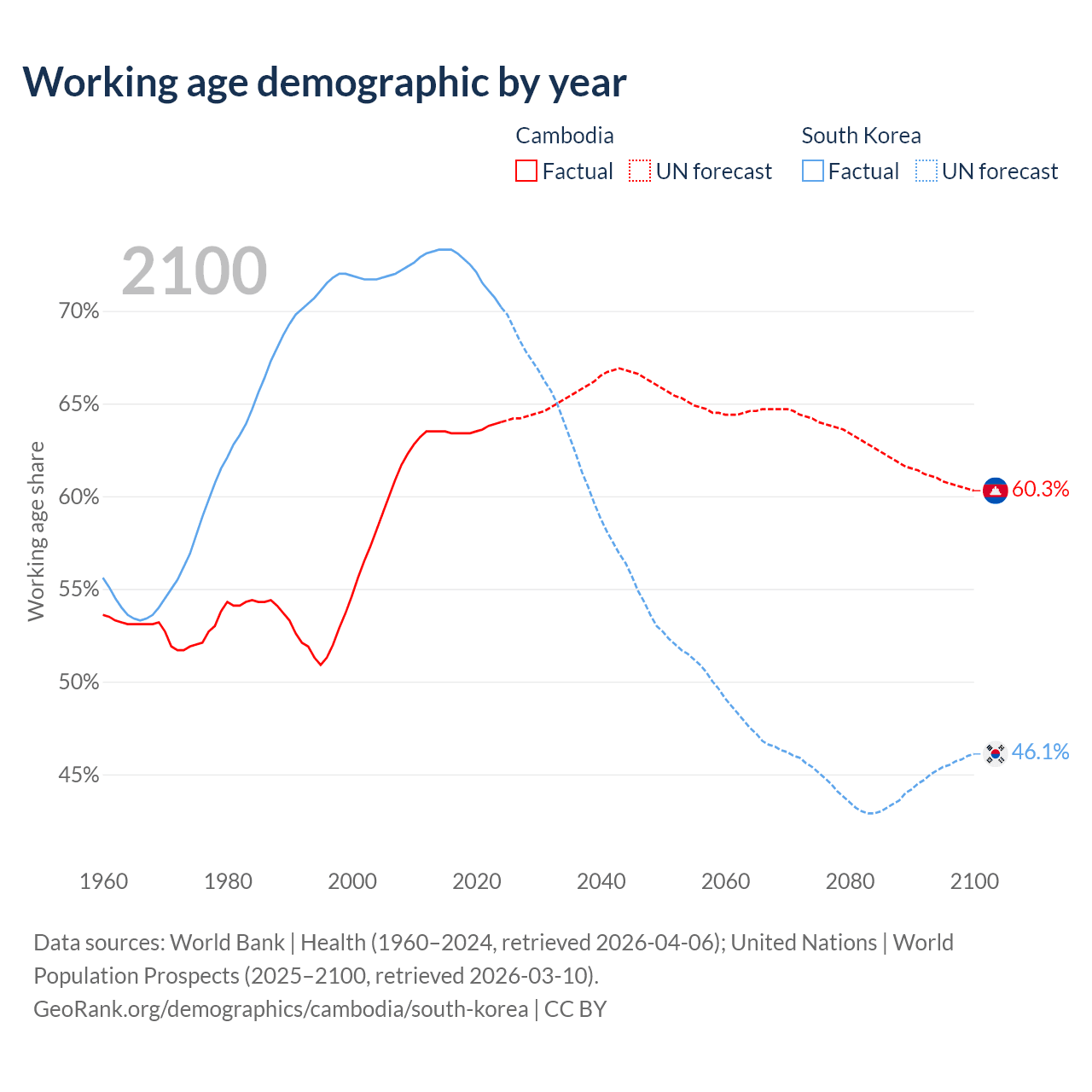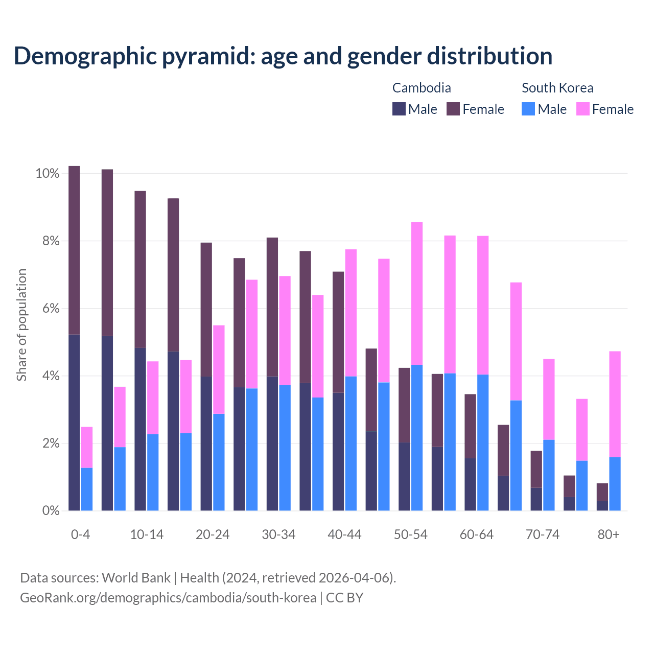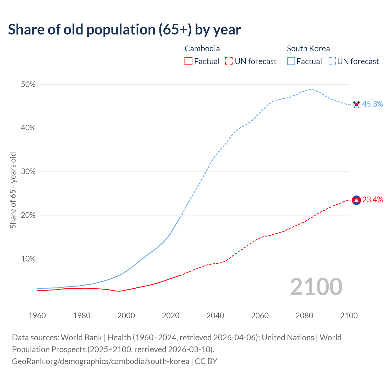 The share of older people aged 65 and over is 6.16% in Cambodia and 19.3% in South Korea. Life expectancy in Cambodia compared to South Korea .