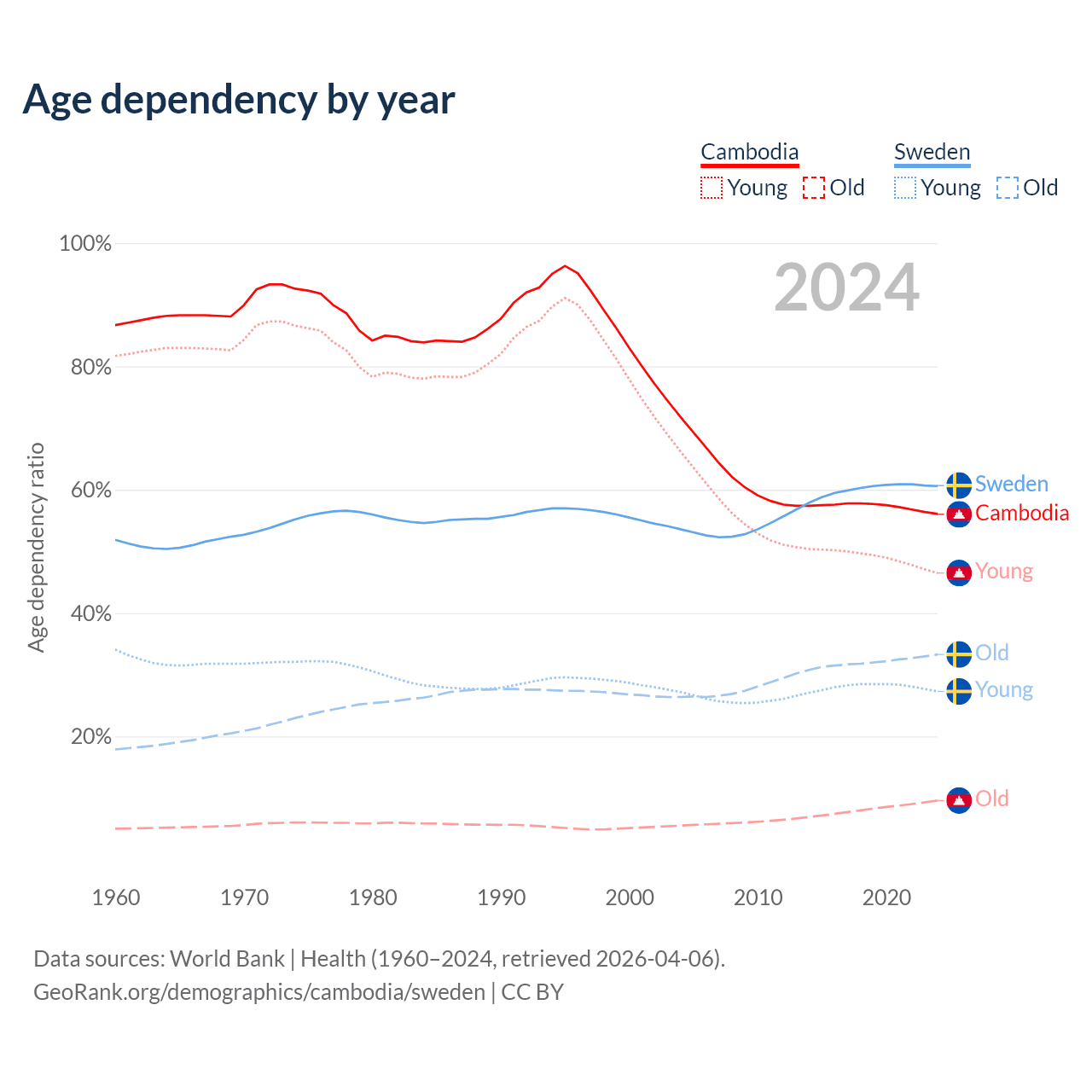 - Cambodia is ranked 121/196 by median age (oldest to youngest) vs 39/196 for Sweden.