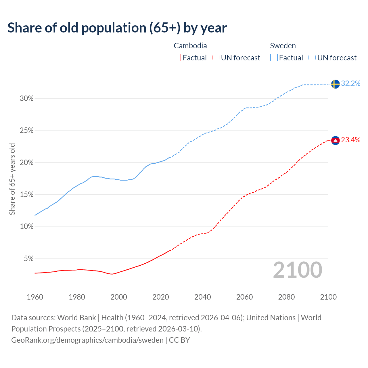 The share of older people aged 65 and over is 6.16% in Cambodia and 20.7% in Sweden. Life expectancy in Cambodia compared to Sweden .
