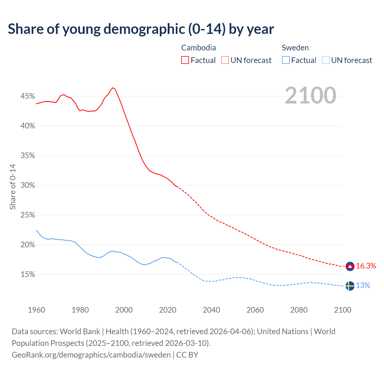 - As of 2026, the population of Cambodia is 18.1M vs 10.7M in Sweden - 1.7 times difference.