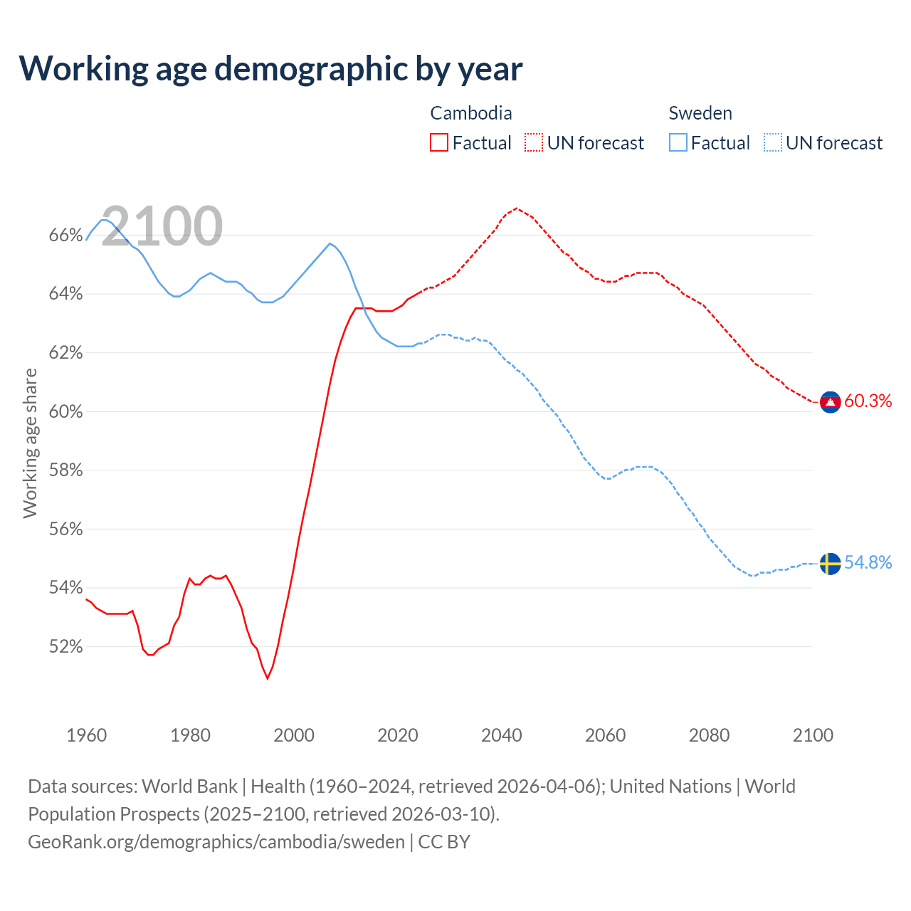 - Cambodia has 11.6M working age adults (aged 15-64) vs 6.65M in Sweden.