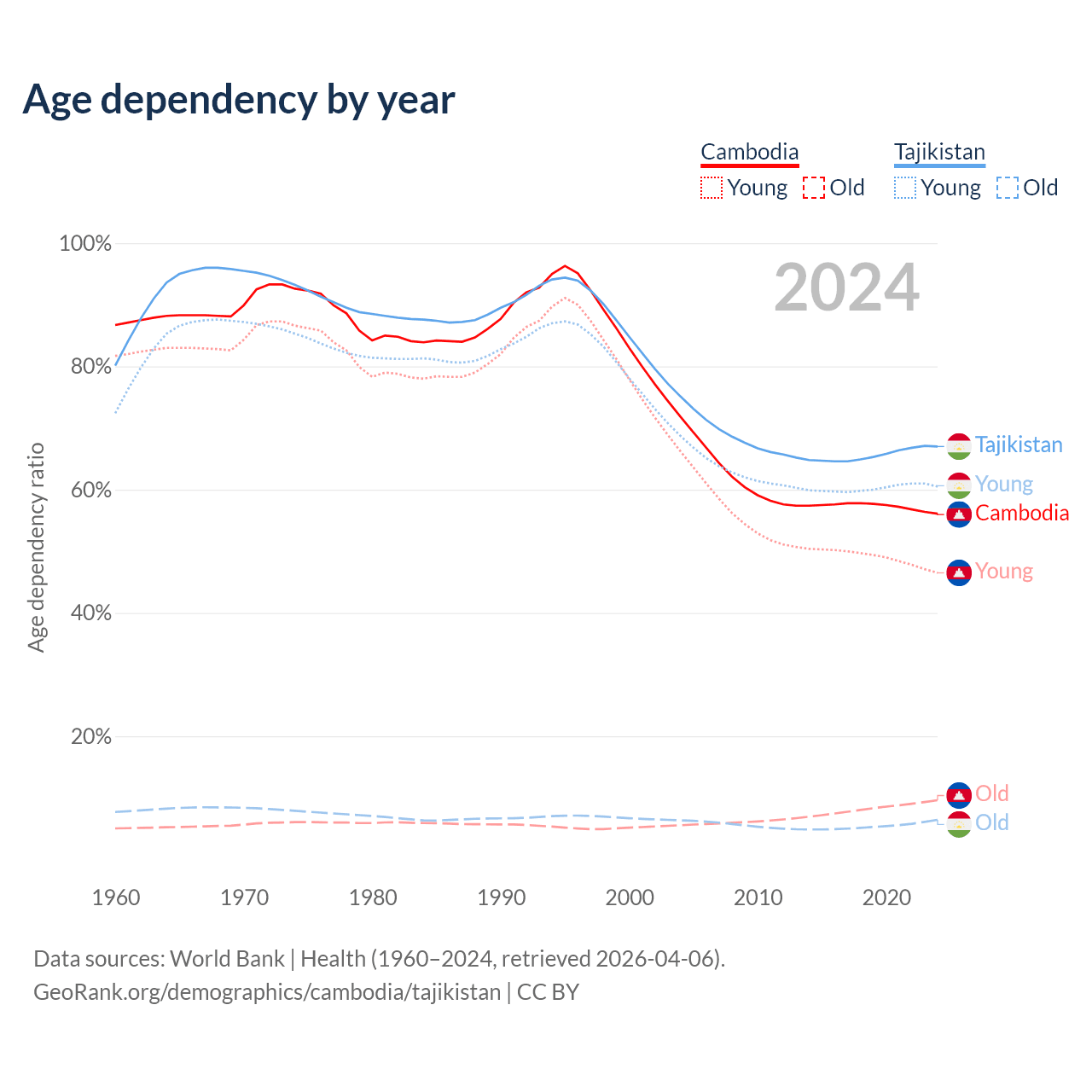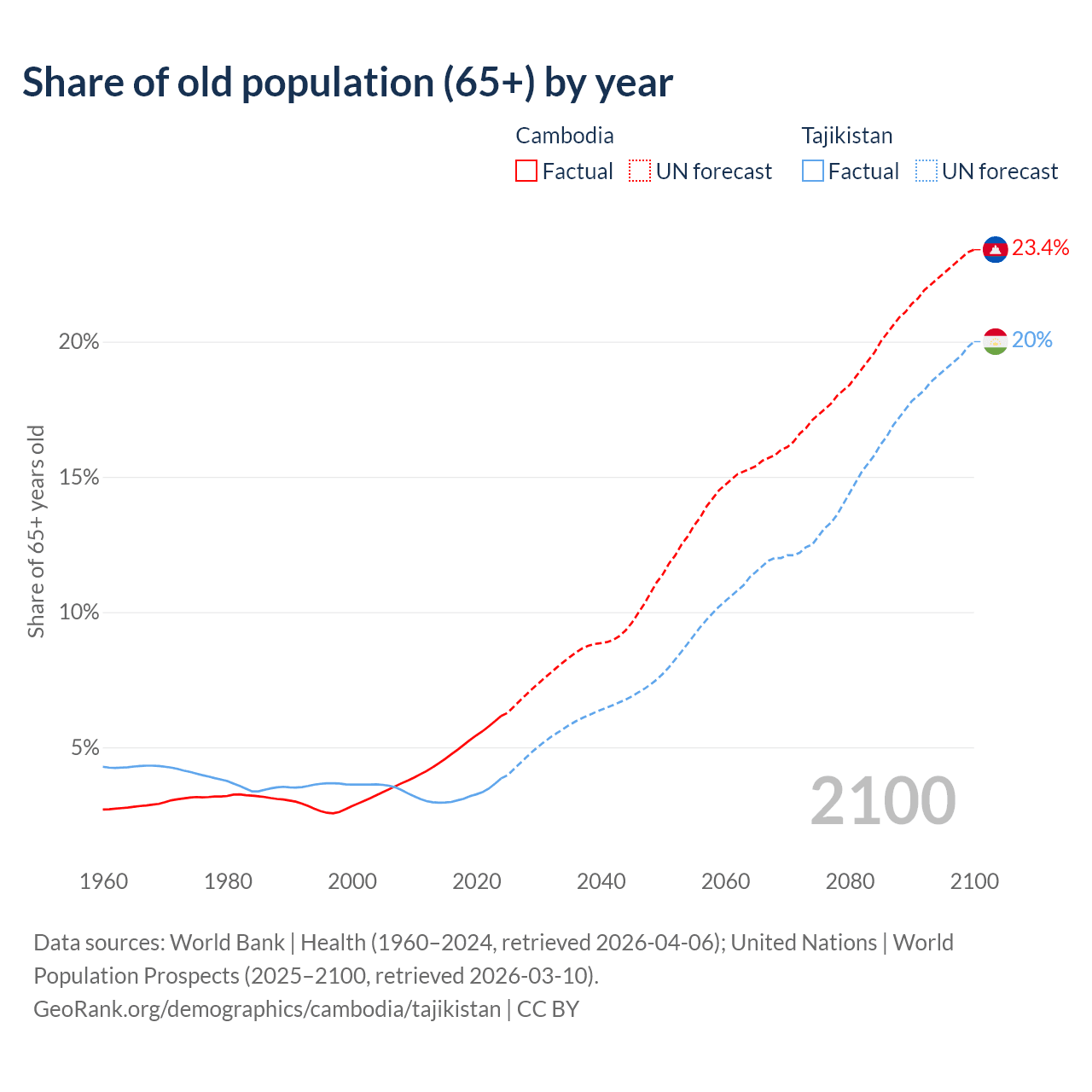- The share of old-age demographic (65+) in Cambodia is 6.16% vs 3.85% in Tajikistan.