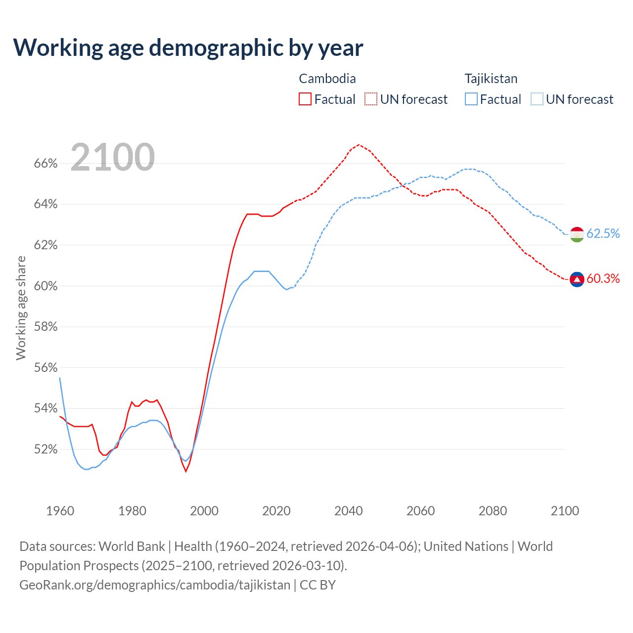 - Cambodia has 11.6M working age adults (aged 15-64) vs 6.61M in Tajikistan.