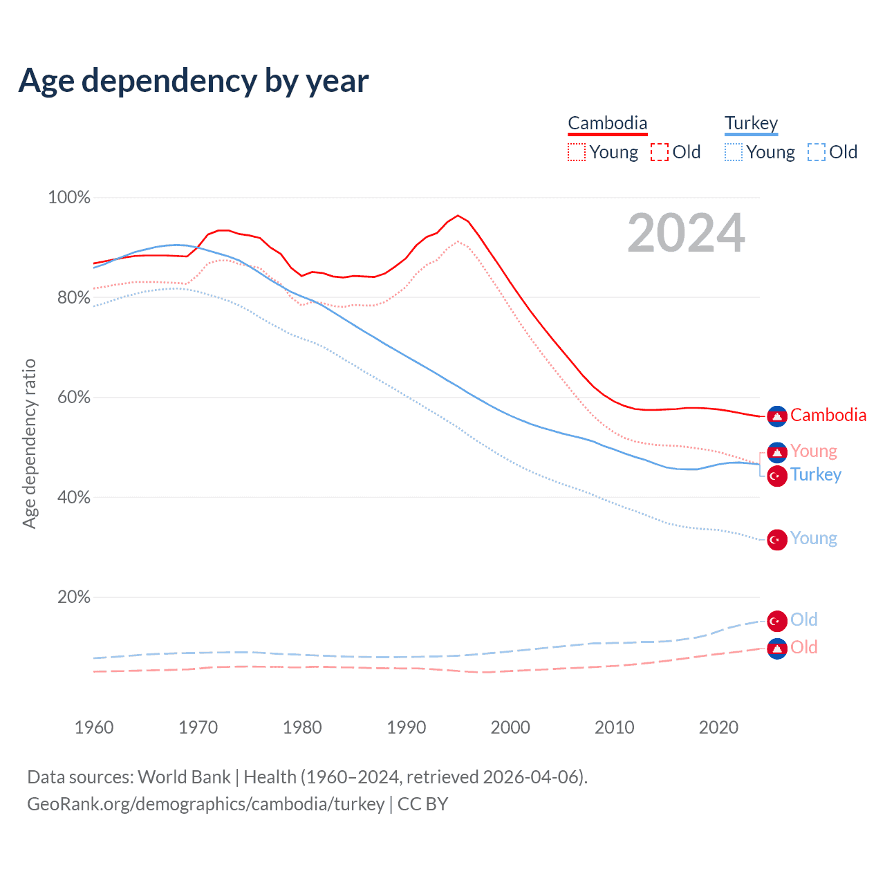 - Cambodia is ranked 121/196 by median age (oldest to youngest) vs 83/196 for Turkey.