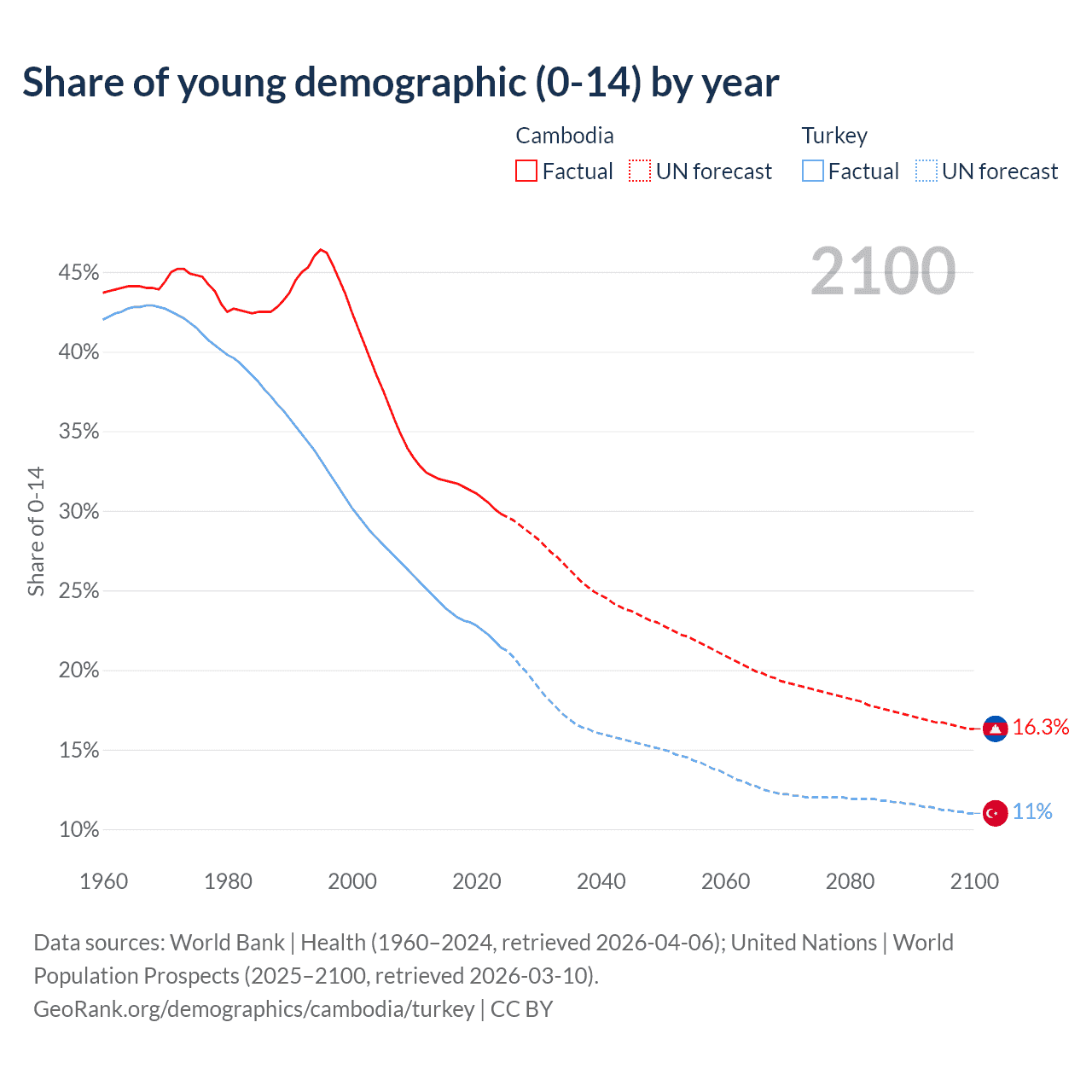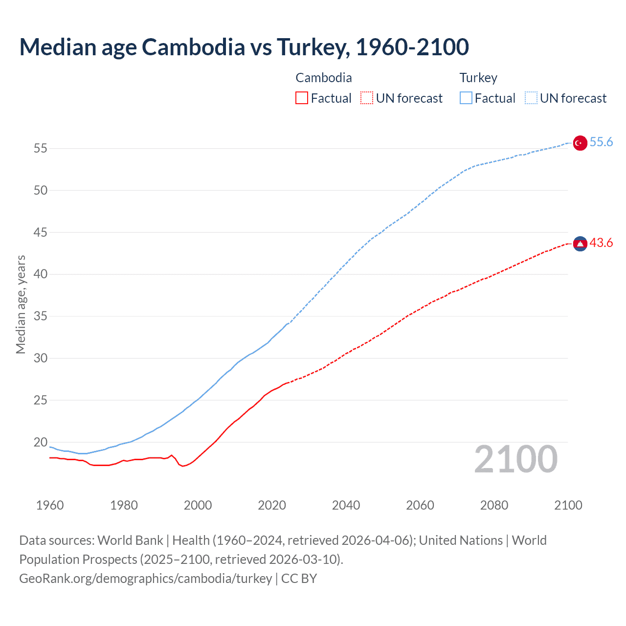 Median age Cambodia vs Turkey, 1960-2100