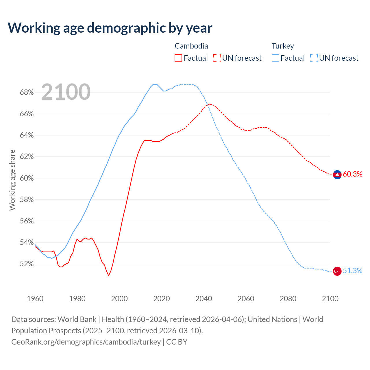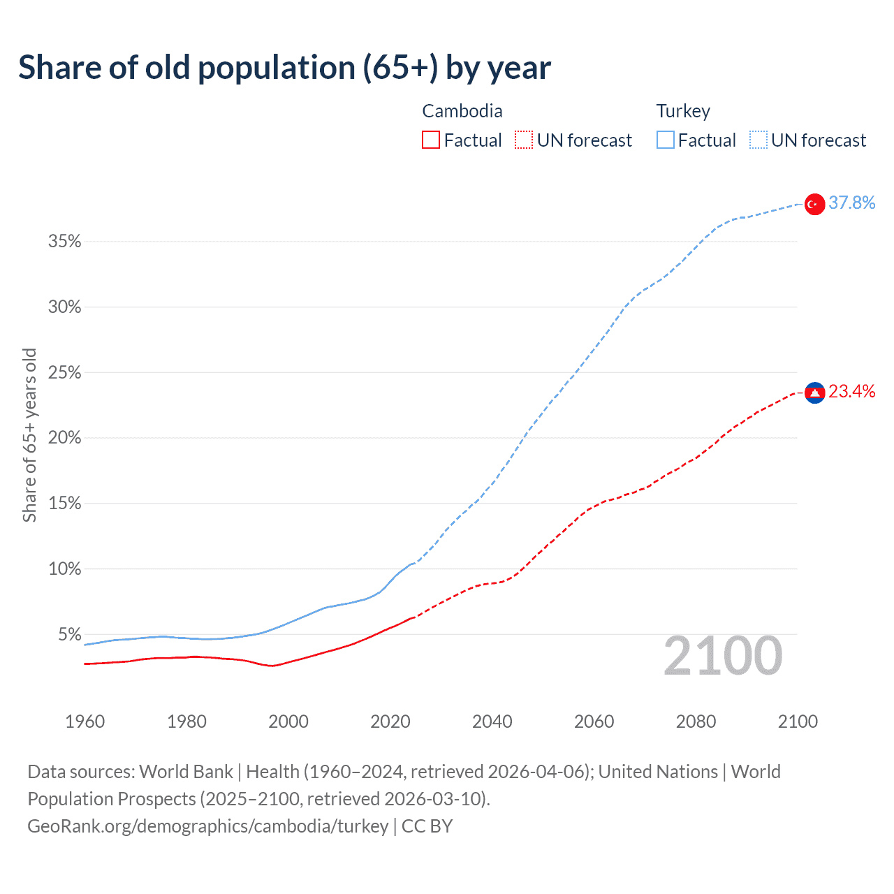 The share of older people aged 65 and over is 6.16% in Cambodia and 10.3% in Turkey. Life expectancy in Cambodia compared to Turkey .