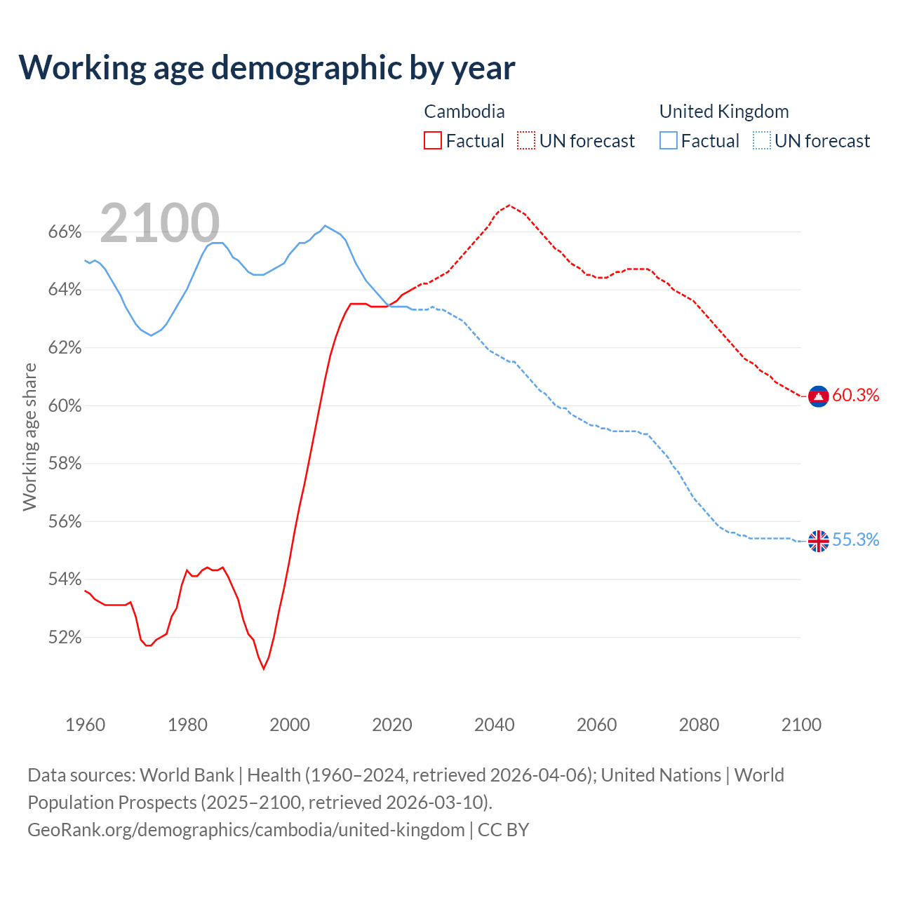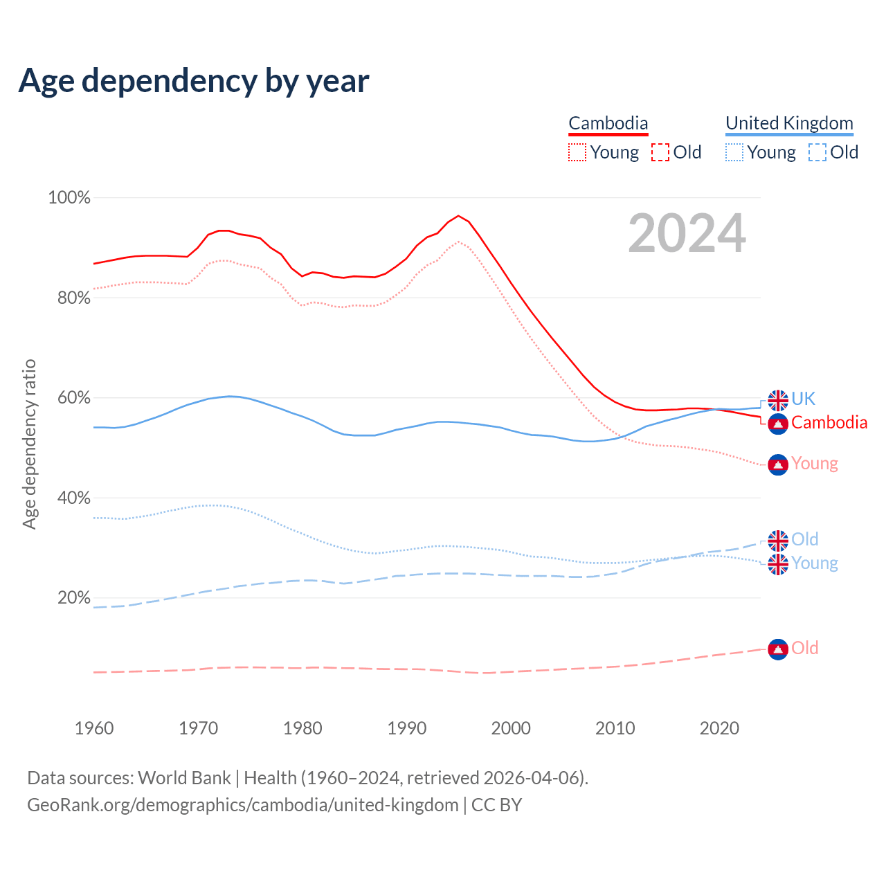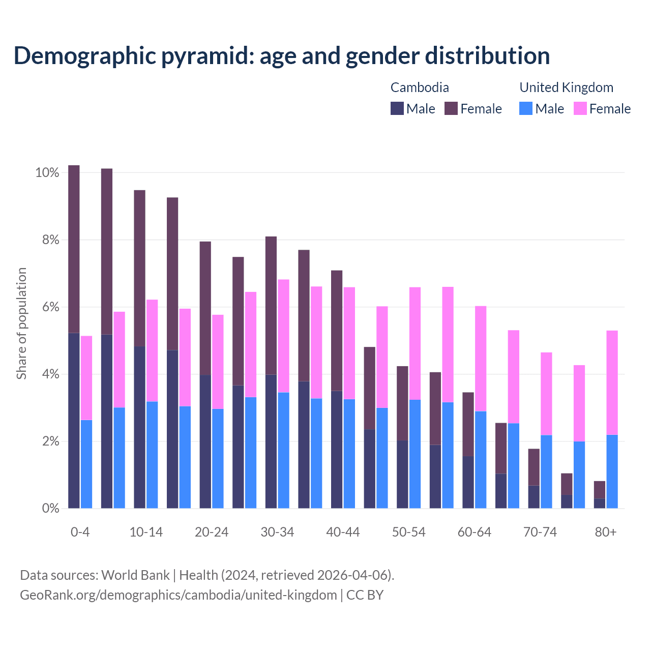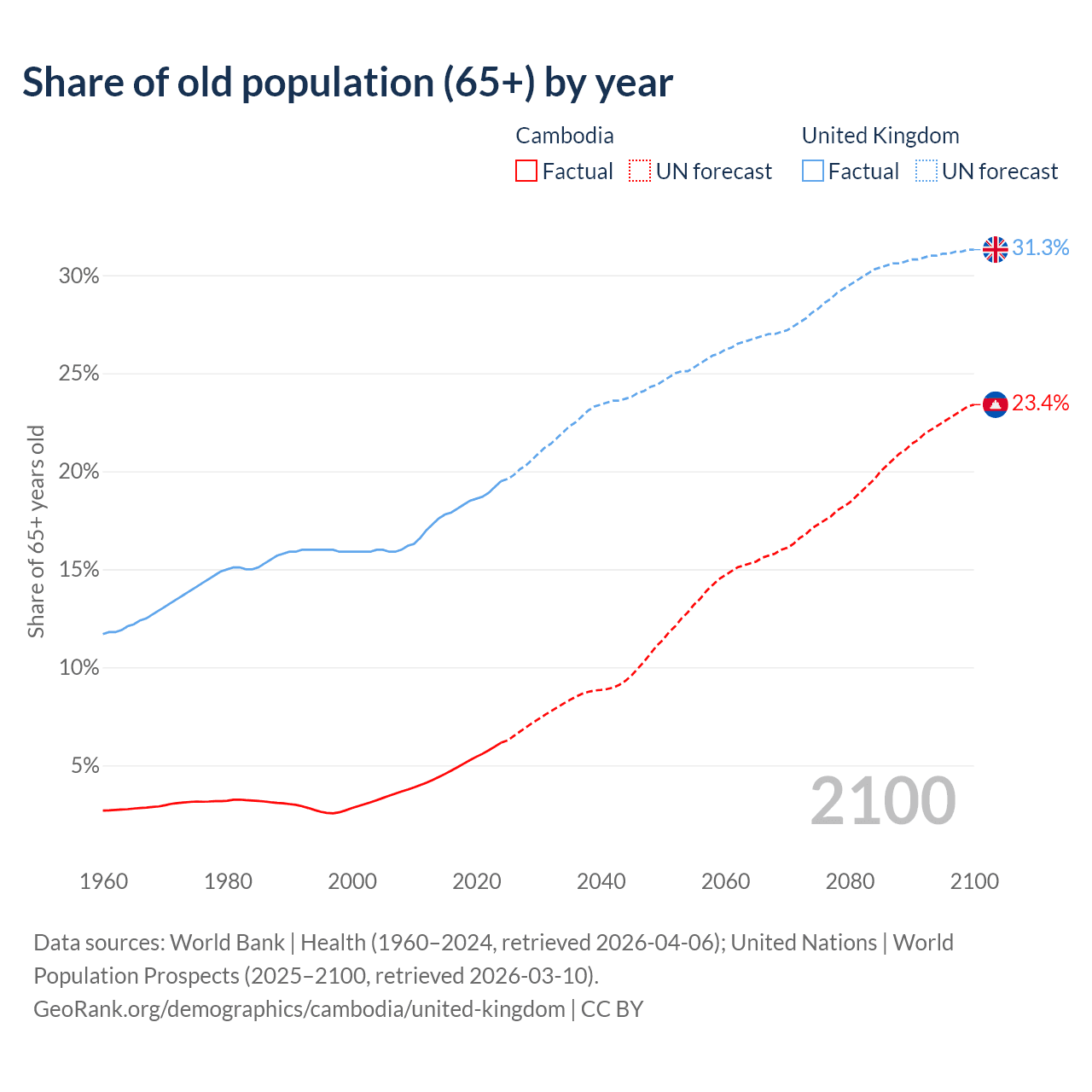 The share of older people aged 65 and over is 6.16% in Cambodia and 19.5% in the United Kingdom. Life expectancy in Cambodia compared to the United Kingdom .