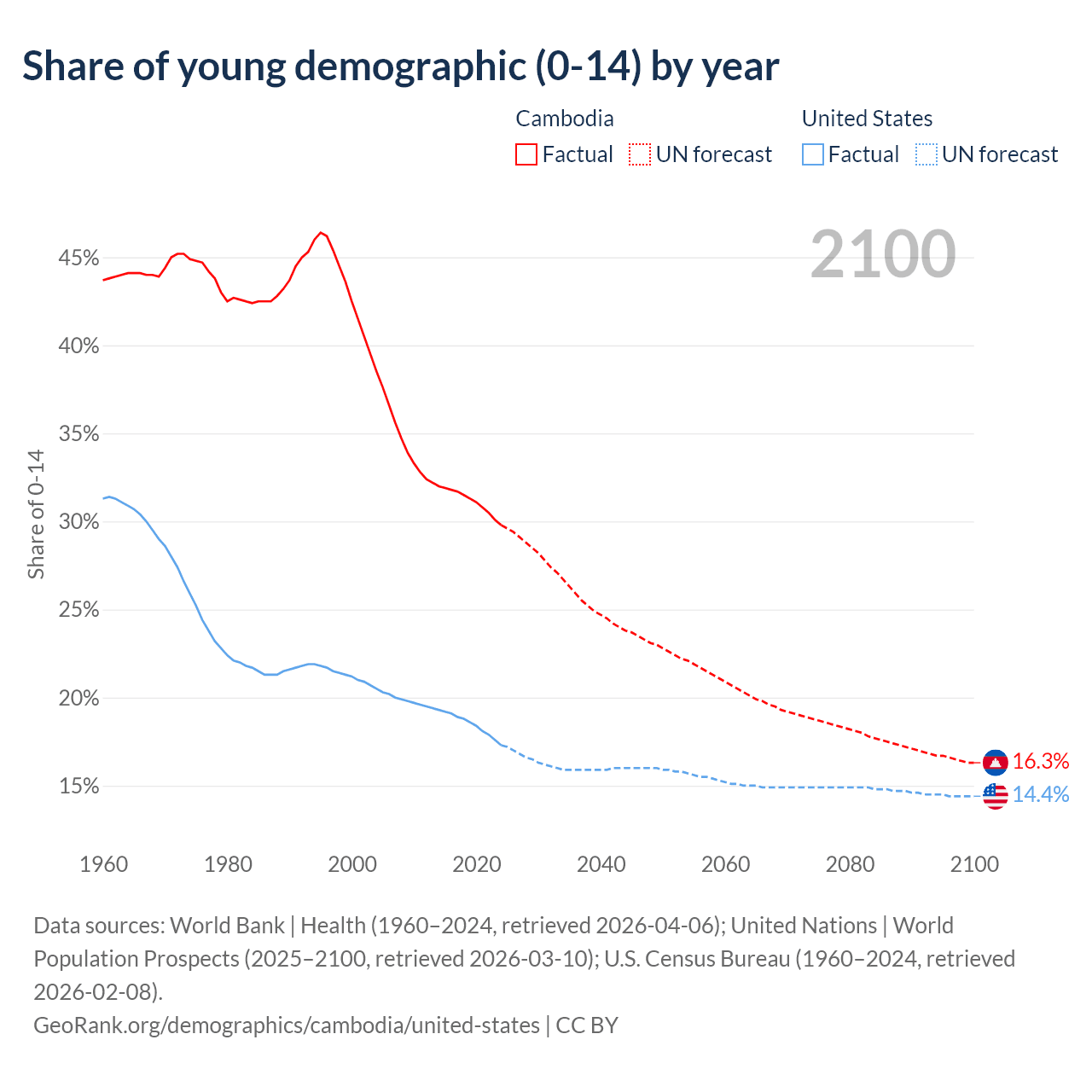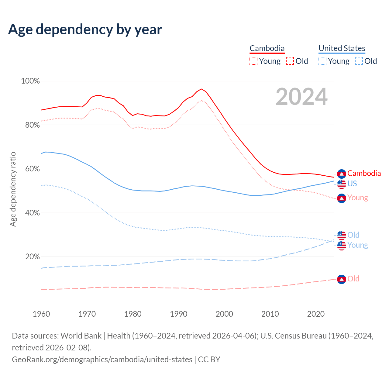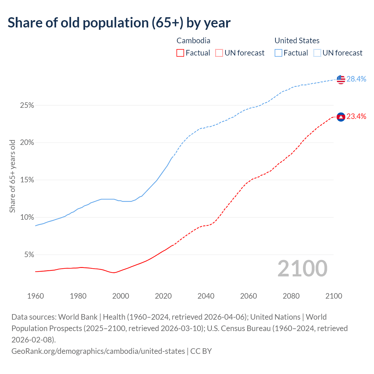 The share of older people aged 65 and over is 6.16% in Cambodia and 17.9% in the United States. Life expectancy in Cambodia compared to the United States .