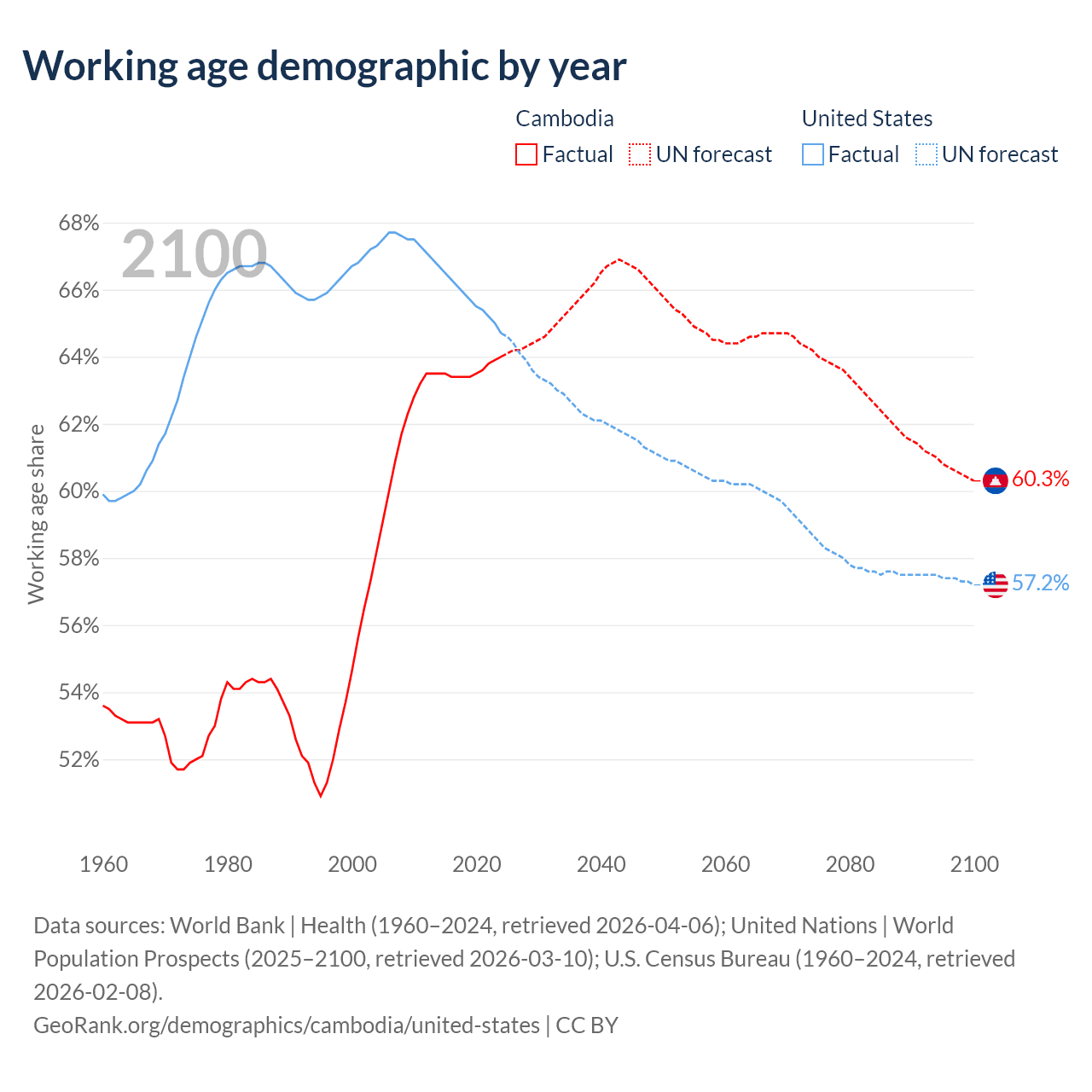 Median age Cambodia vs United States, 1960-2100