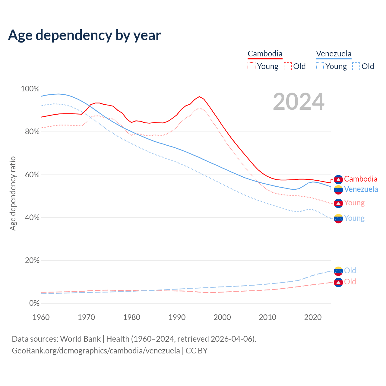 - The share of old-age demographic (65+) in Cambodia is 6.16% vs 9.68% in Venezuela.