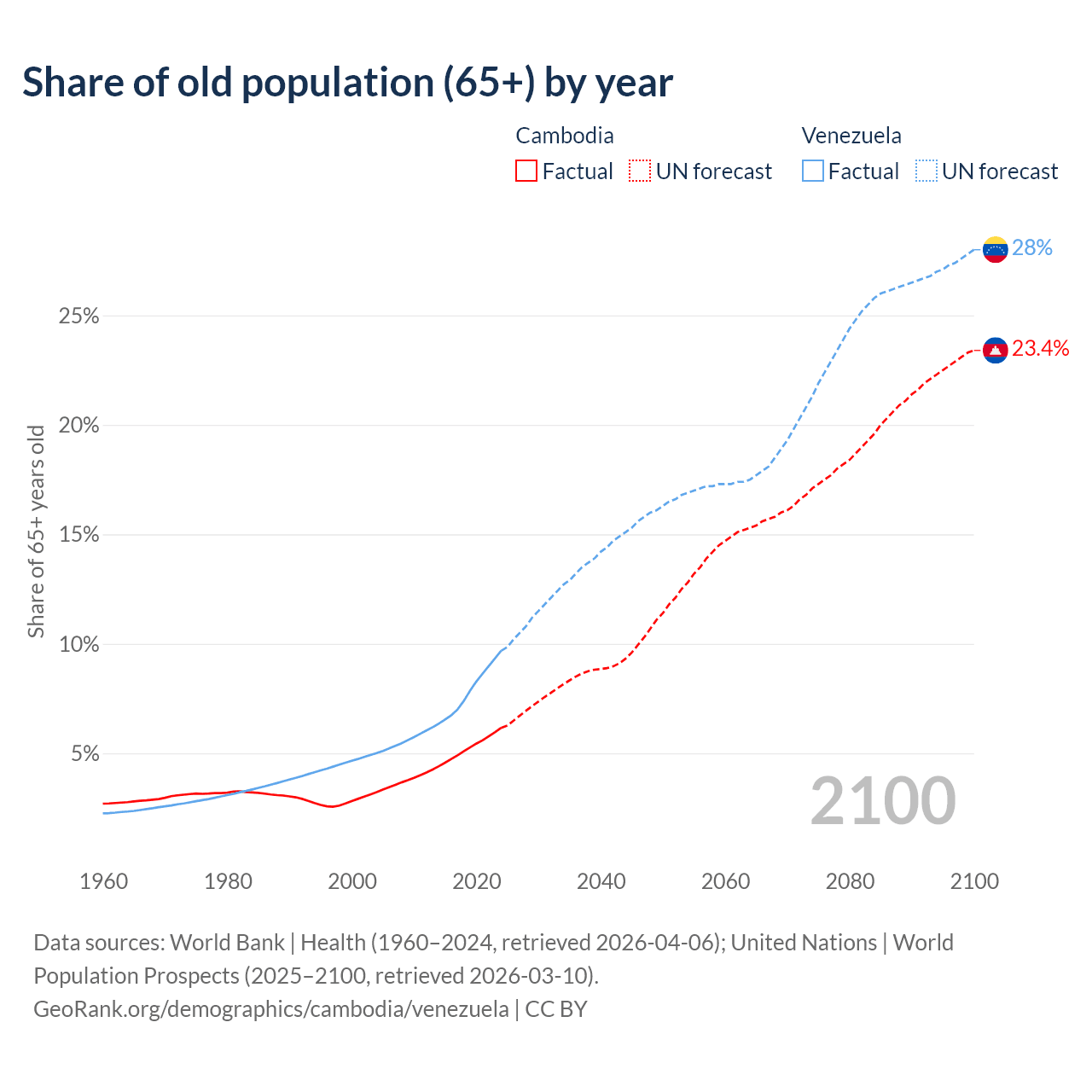 The share of older people aged 65 and over is 6.16% in Cambodia and 9.68% in Venezuela. Life expectancy in Cambodia compared to Venezuela .