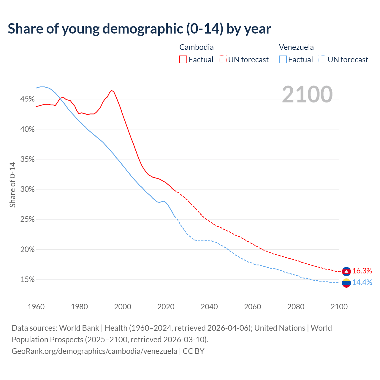 - The share of young demographic (0-15 years old) in Cambodia is 29.8% vs 25.5% in Venezuela.