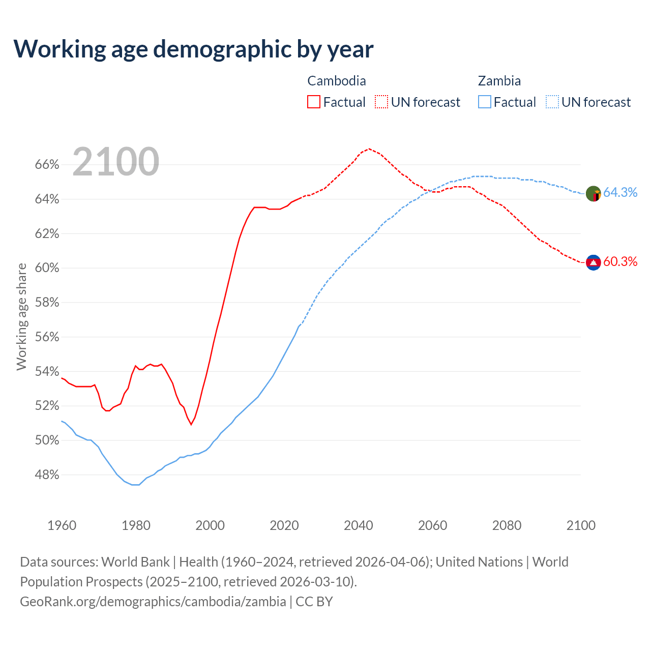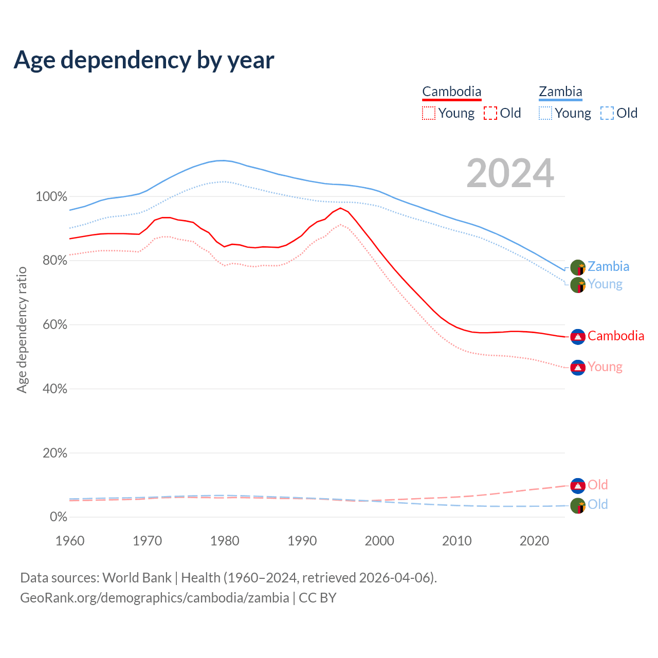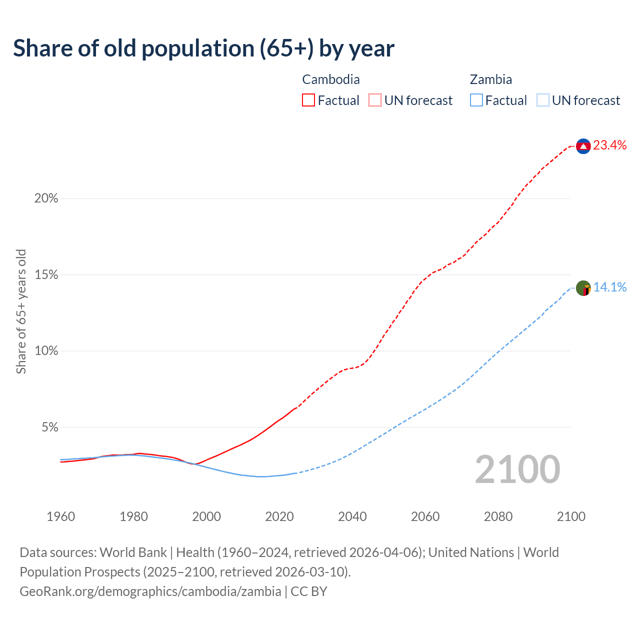 The share of older people aged 65 and over is 6.16% in Cambodia and 1.95% in Zambia. Life expectancy in Cambodia compared to Zambia .