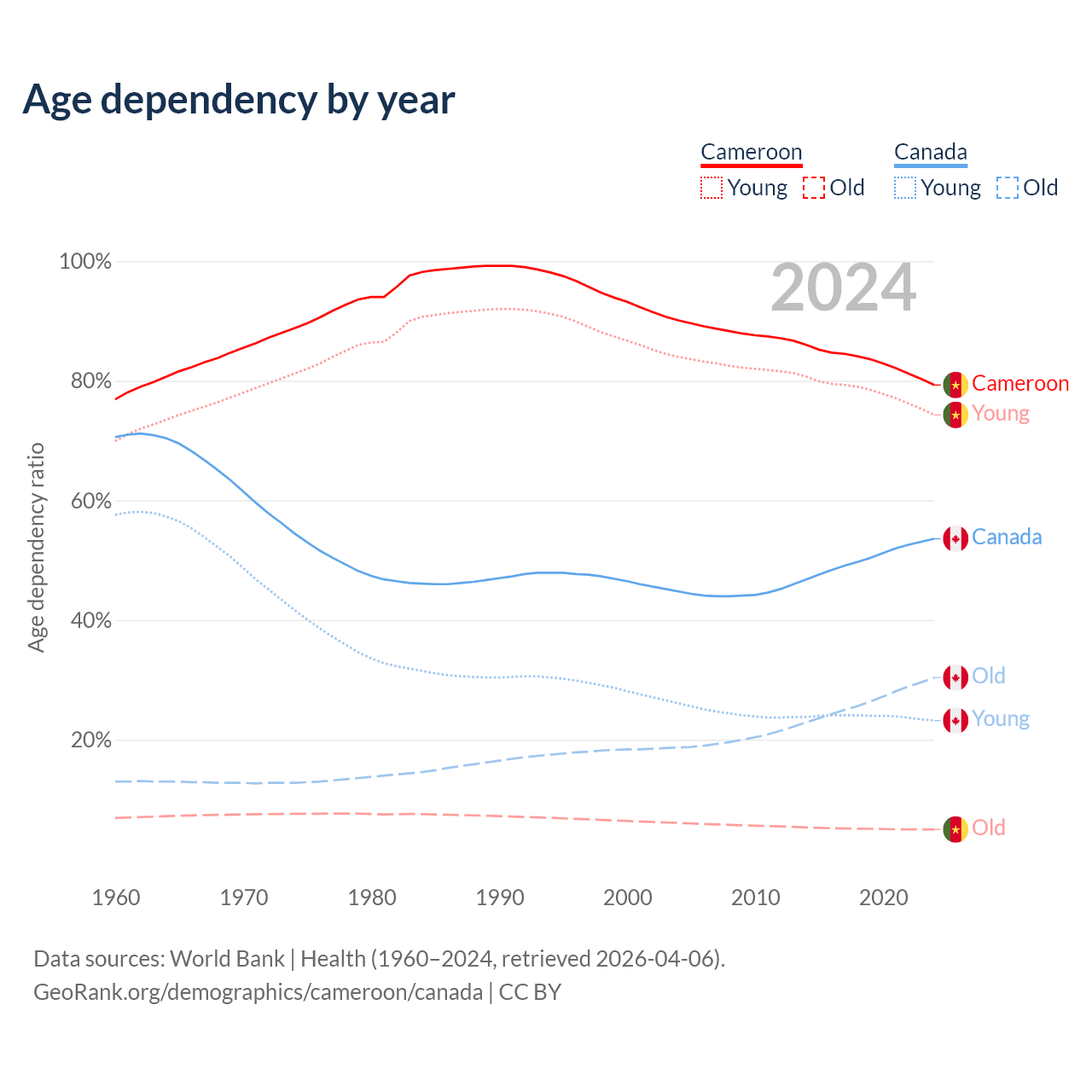 The share of older people aged 65 and over is 2.79% in Cameroon and 19.8% in Canada. Life expectancy in Cameroon compared to Canada .