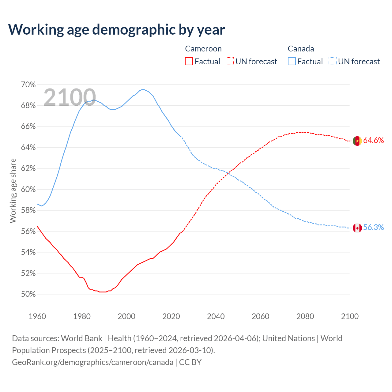 Median age Cameroon vs Canada, 1960-2100