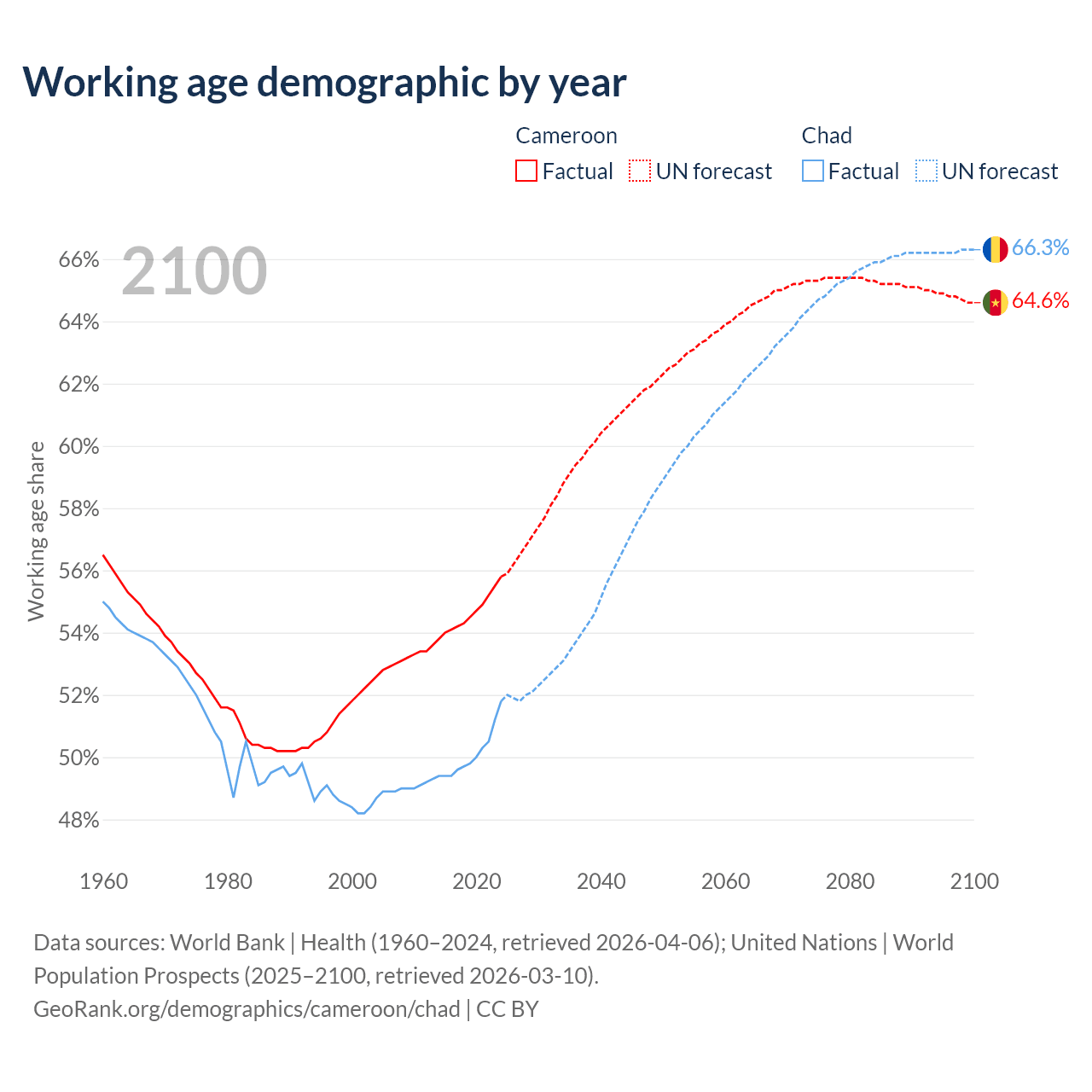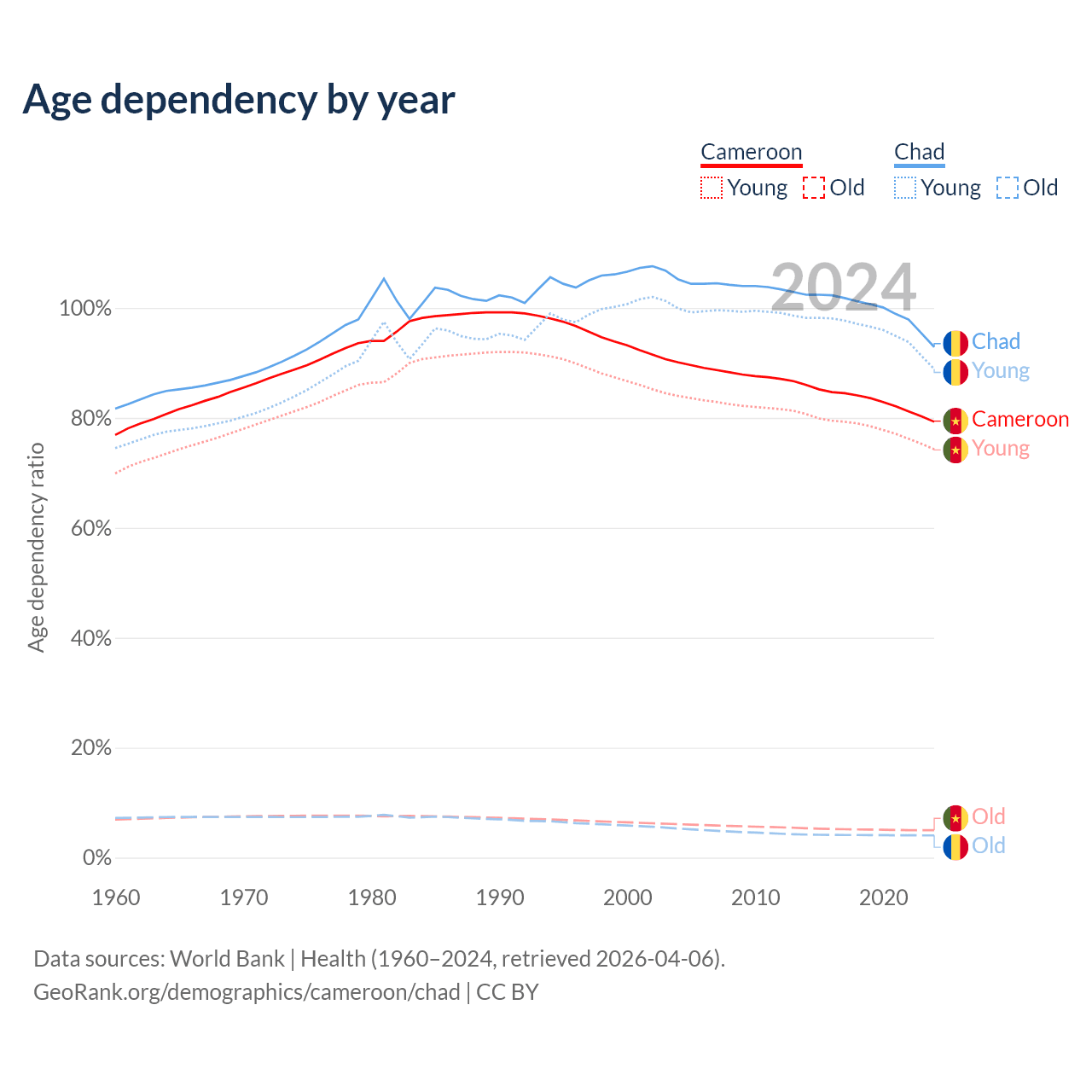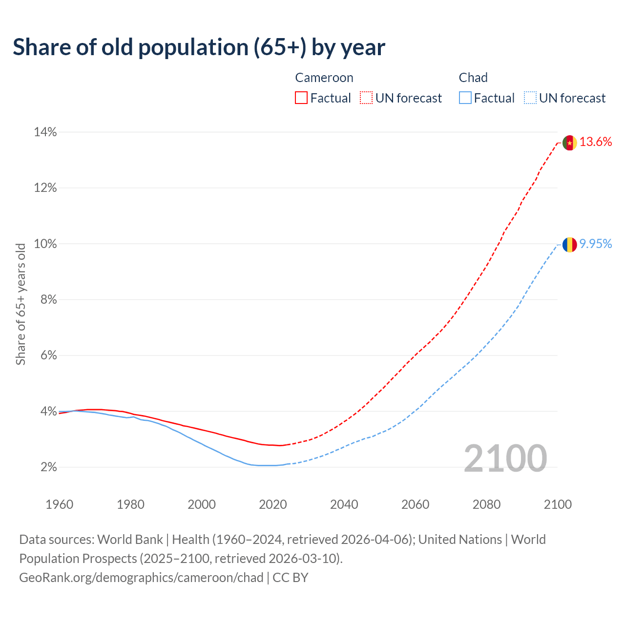 The share of older people aged 65 and over is 2.79% in Cameroon and 2.1% in Chad. Life expectancy in Cameroon compared to Chad .