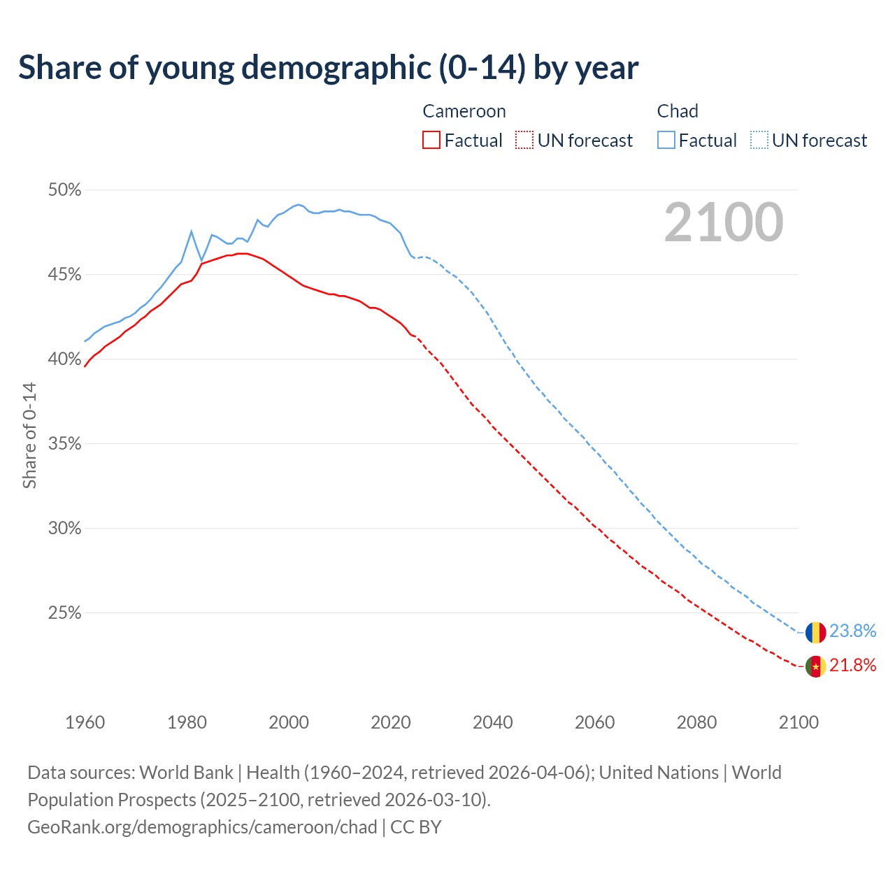 - The share of young demographic (0-15 years old) in Cameroon is 41.4% vs 46.1% in Chad.