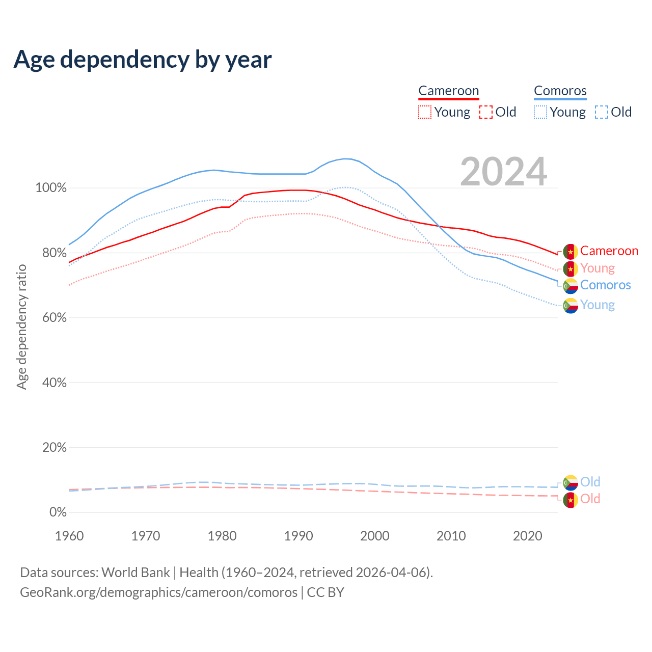 - Cameroon is ranked 180/196 by median age (oldest to youngest) vs 152/196 for Comoros.