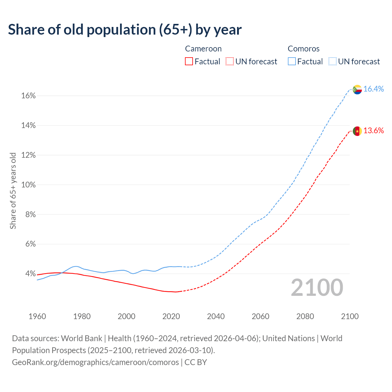 The share of older people aged 65 and over is 2.79% in Cameroon and 4.47% in Comoros. Life expectancy in Cameroon compared to Comoros .
