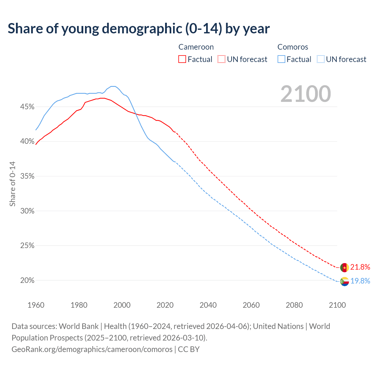 - The share of young demographic (0-15 years old) in Cameroon is 41.4% vs 37.1% in Comoros.