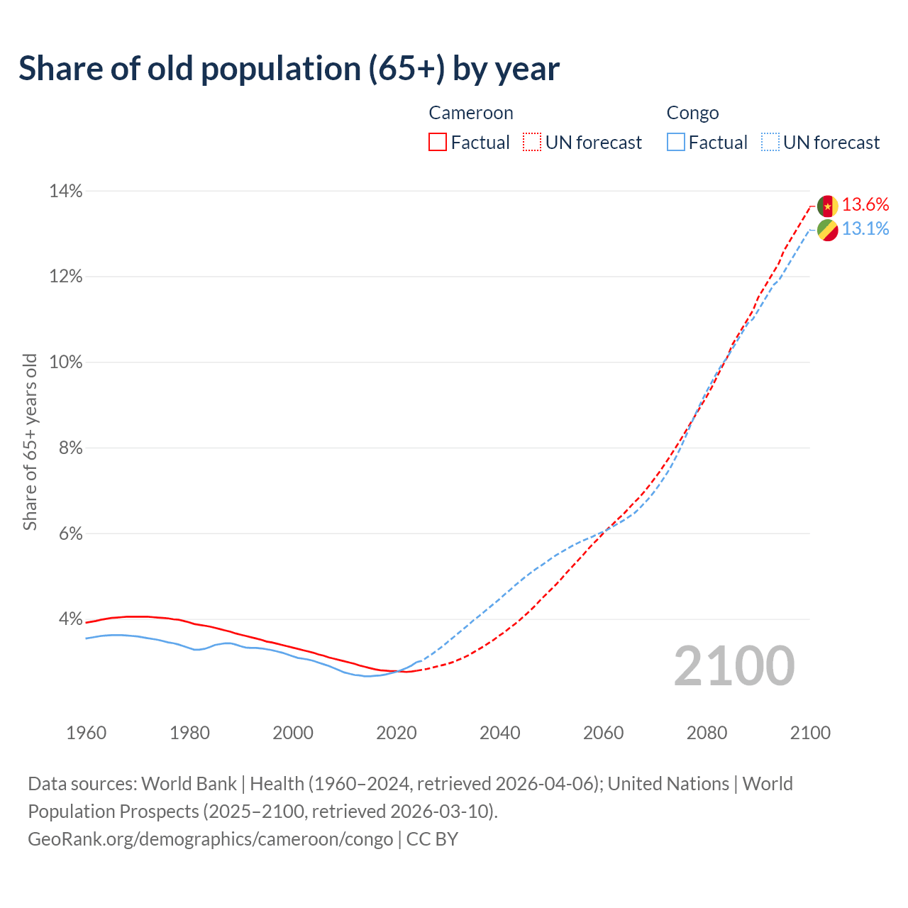 The share of older people aged 65 and over is 2.79% in Cameroon and 2.99% in the Congo. Life expectancy in Cameroon compared to the Congo .
