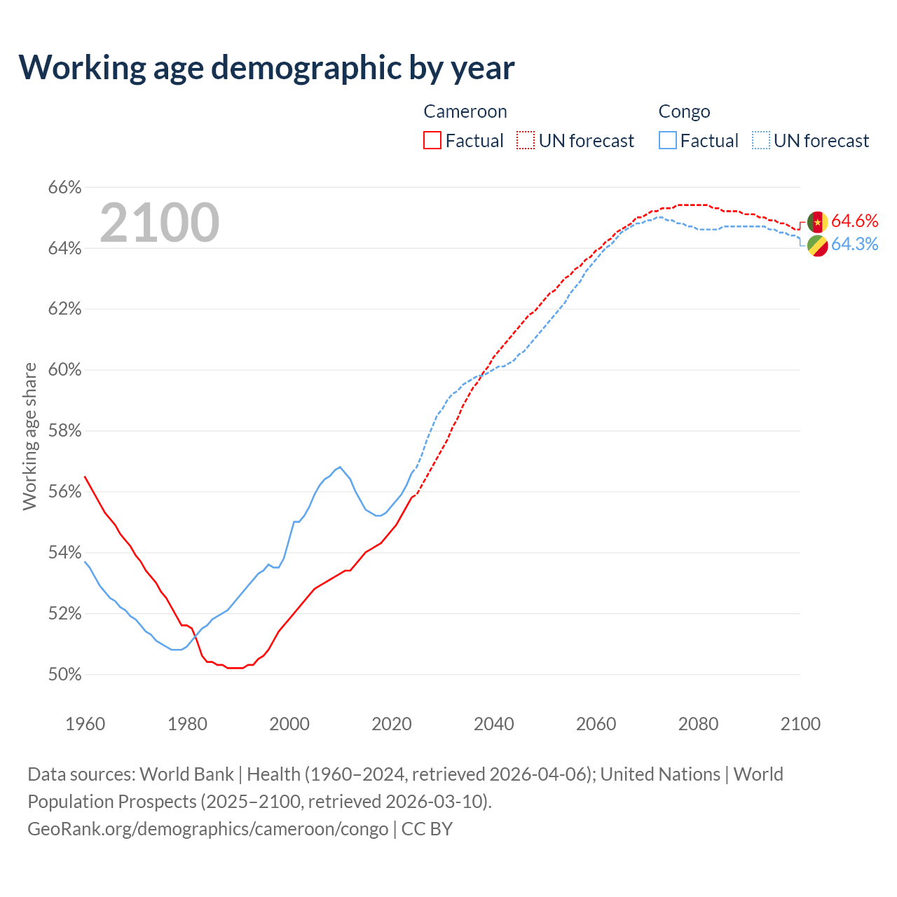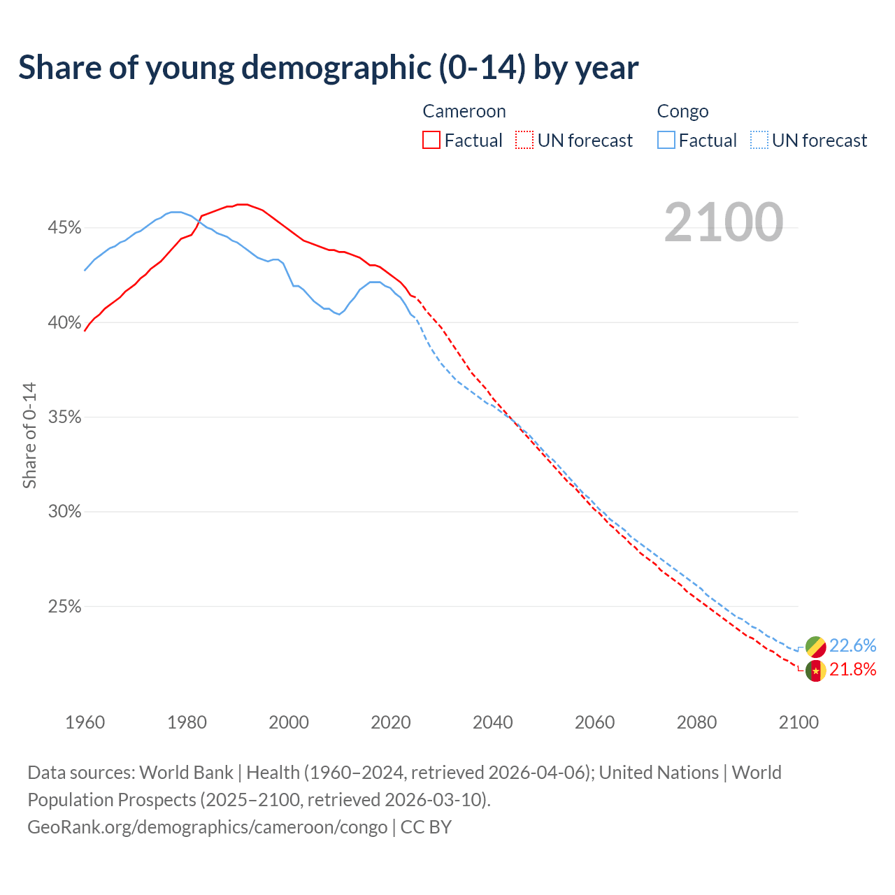 Median age Cameroon vs Congo, 1960-2100
