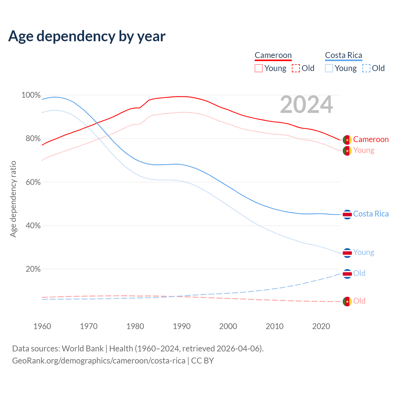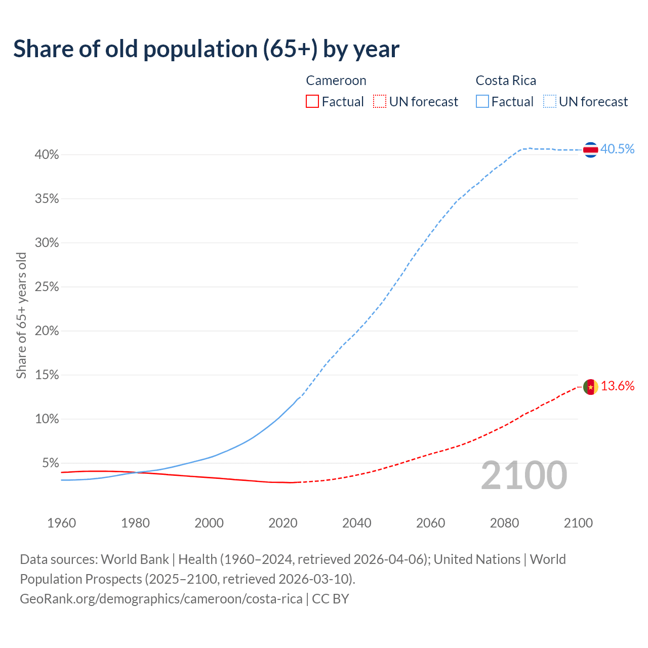 The share of older people aged 65 and over is 2.79% in Cameroon and 12.2% in Costa Rica. Life expectancy in Cameroon compared to Costa Rica .