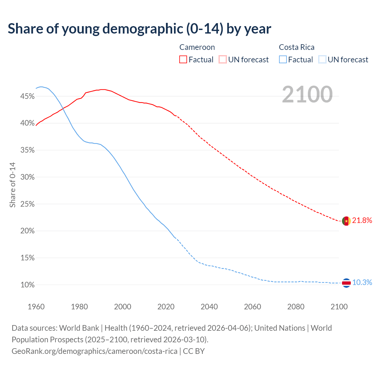 - The share of young demographic (0-15 years old) in Cameroon is 41.4% vs 18.8% in Costa Rica.