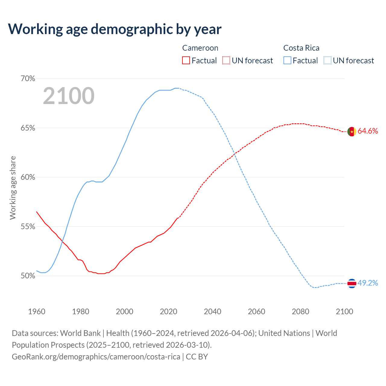 - Cameroon has 17.2M working age adults (aged 15-64) vs 3.57M in Costa Rica.