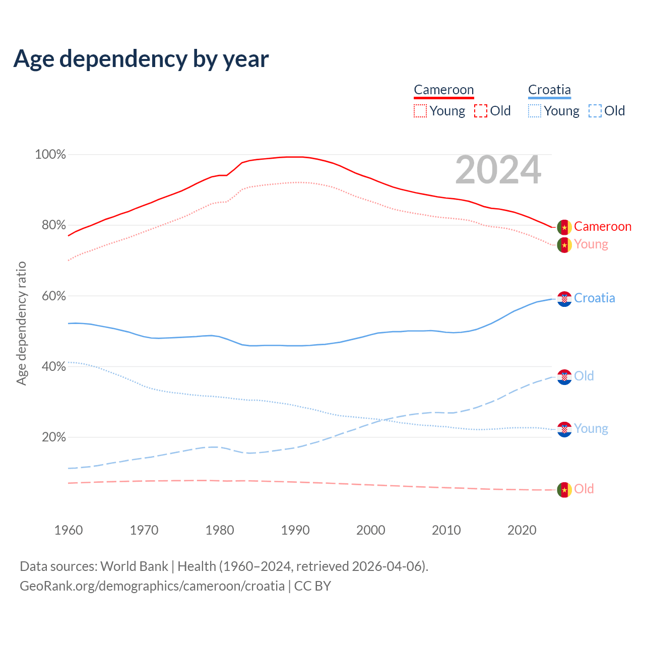 The share of older people aged 65 and over is 2.79% in Cameroon and 23.2% in Croatia. Life expectancy in Cameroon compared to Croatia .