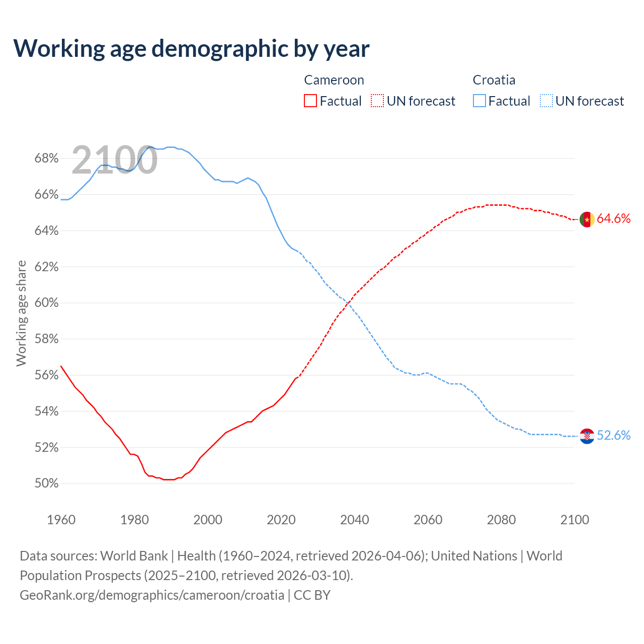 Median age Cameroon vs Croatia, 1960-2100