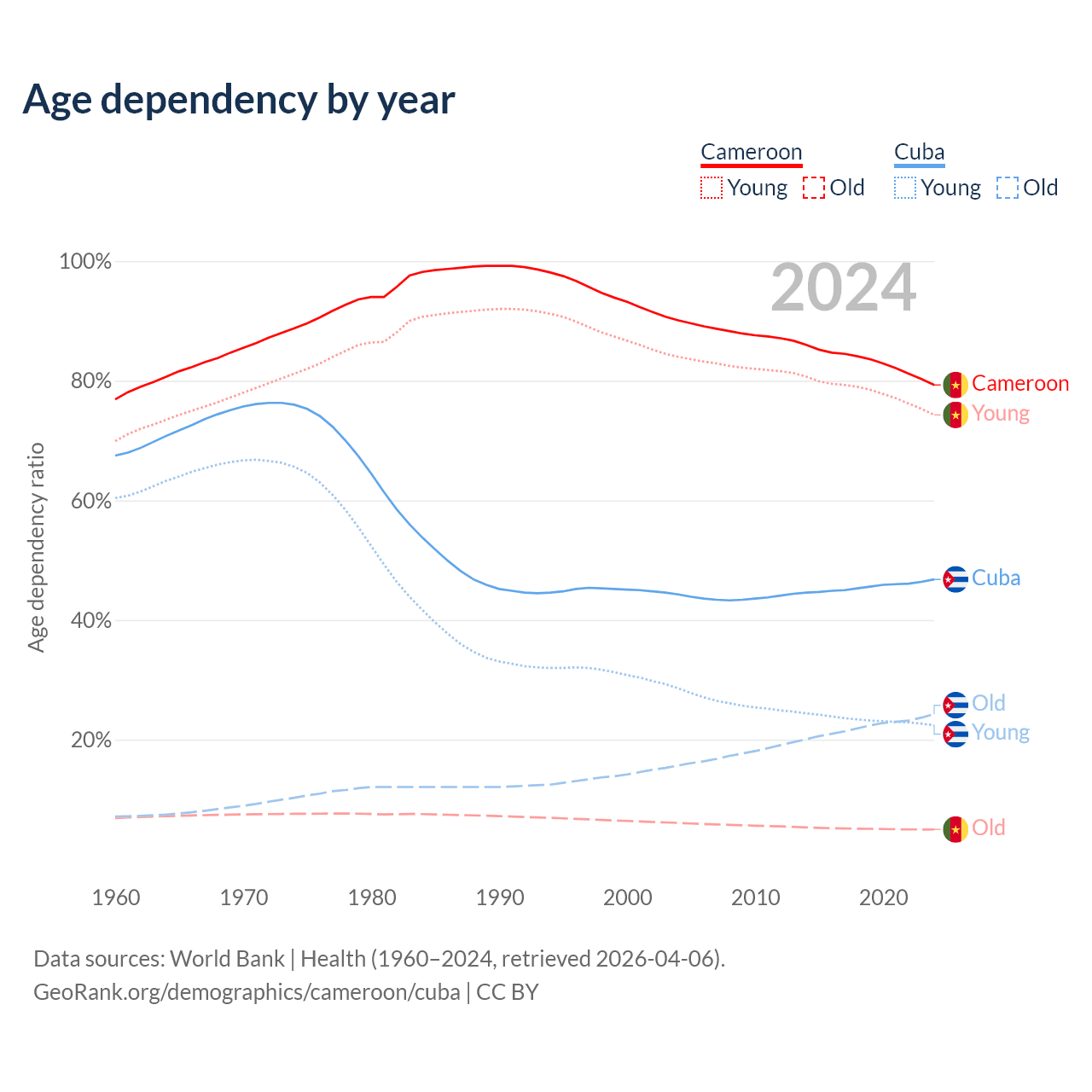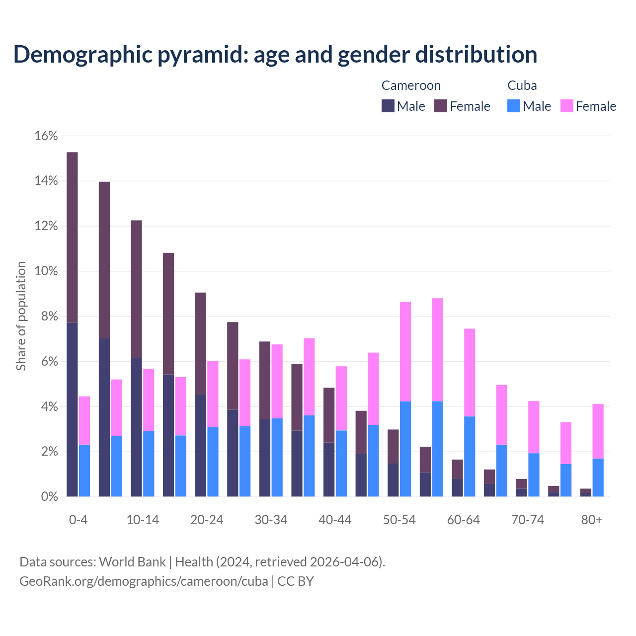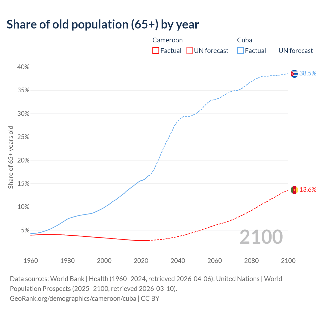 The share of older people aged 65 and over is 2.79% in Cameroon and 16.6% in Cuba. Life expectancy in Cameroon compared to Cuba .