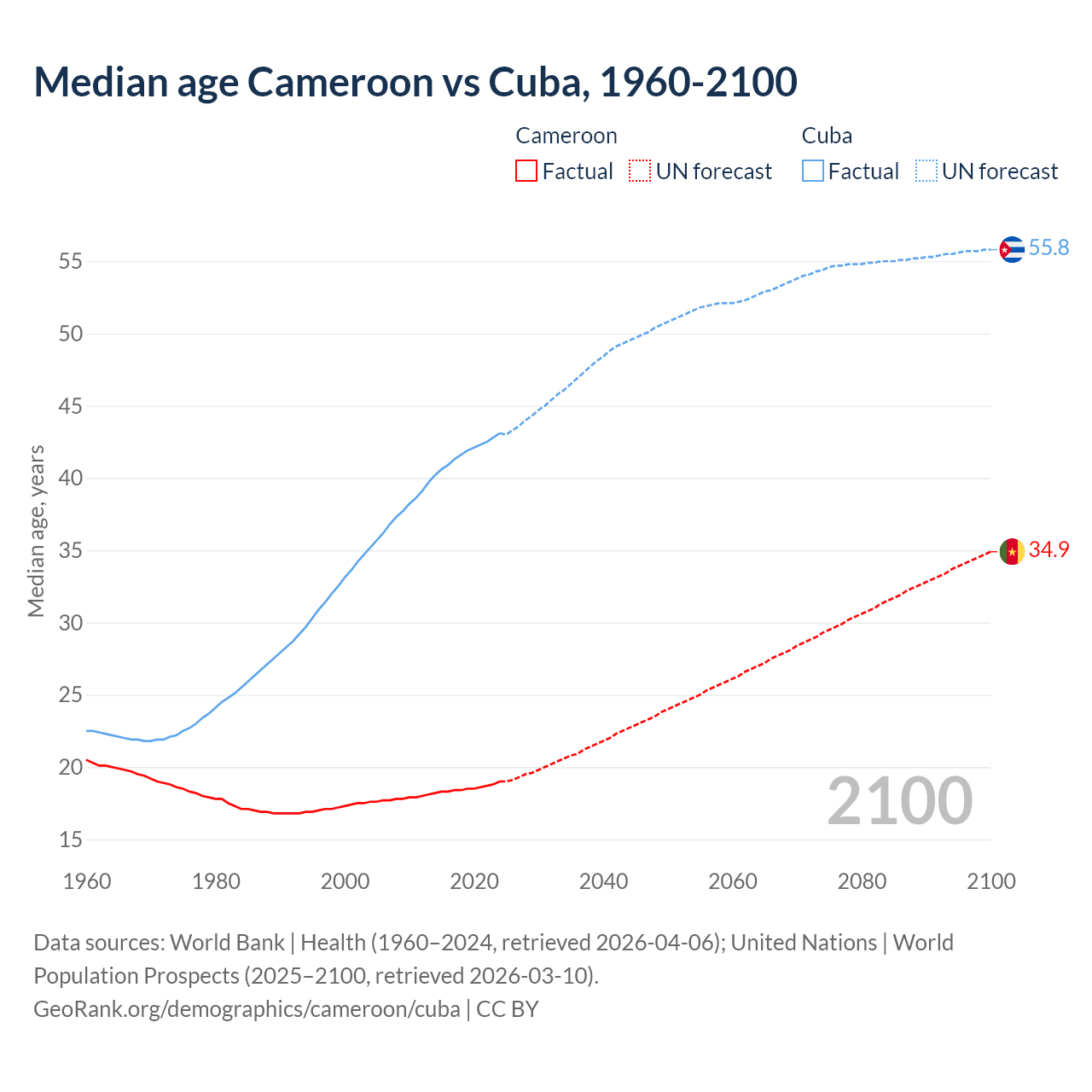 - Cameroon is ranked 180/196 by median age (oldest to youngest) vs 27/196 for Cuba.