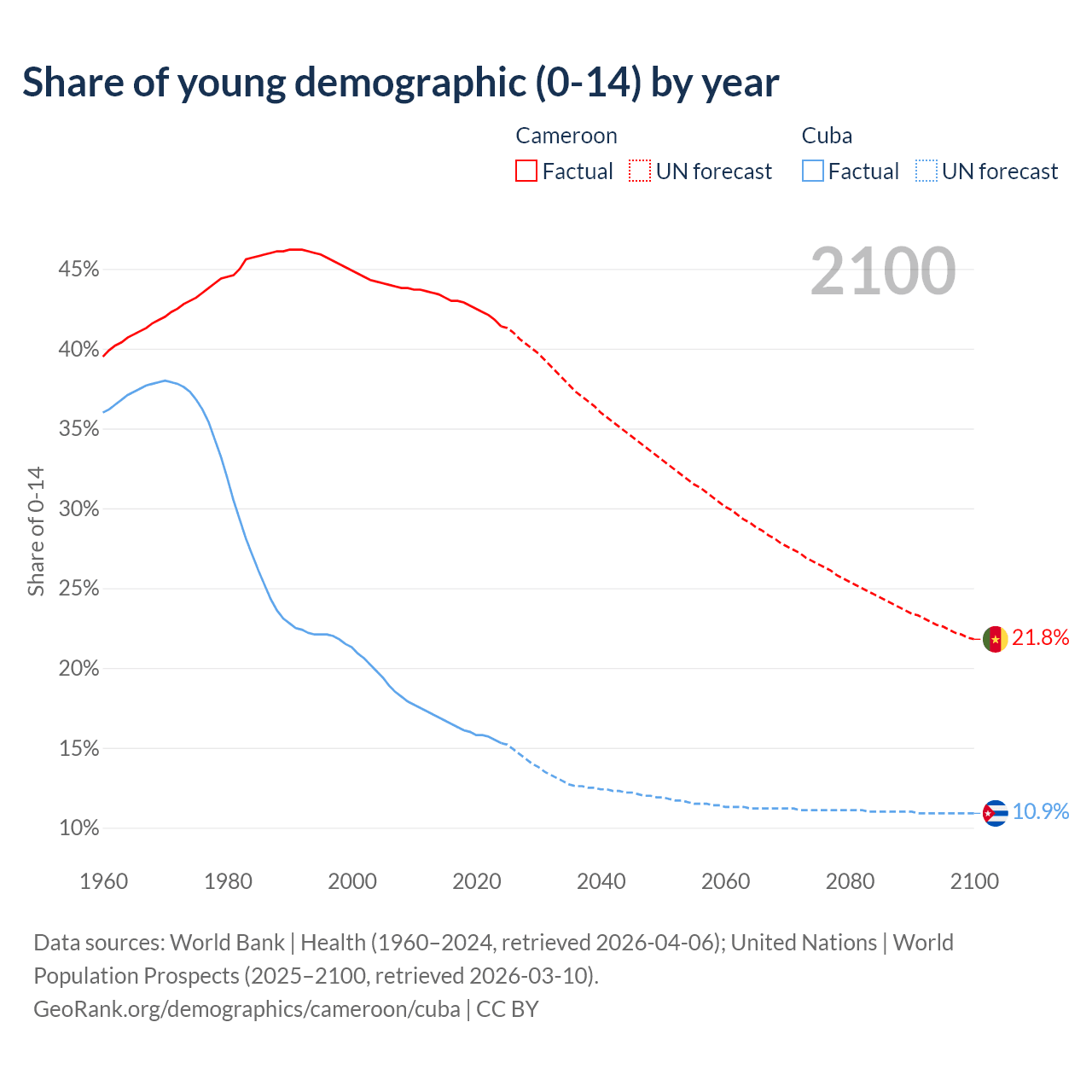 - The share of young demographic (0-15 years old) in Cameroon is 41.4% vs 15.3% in Cuba.