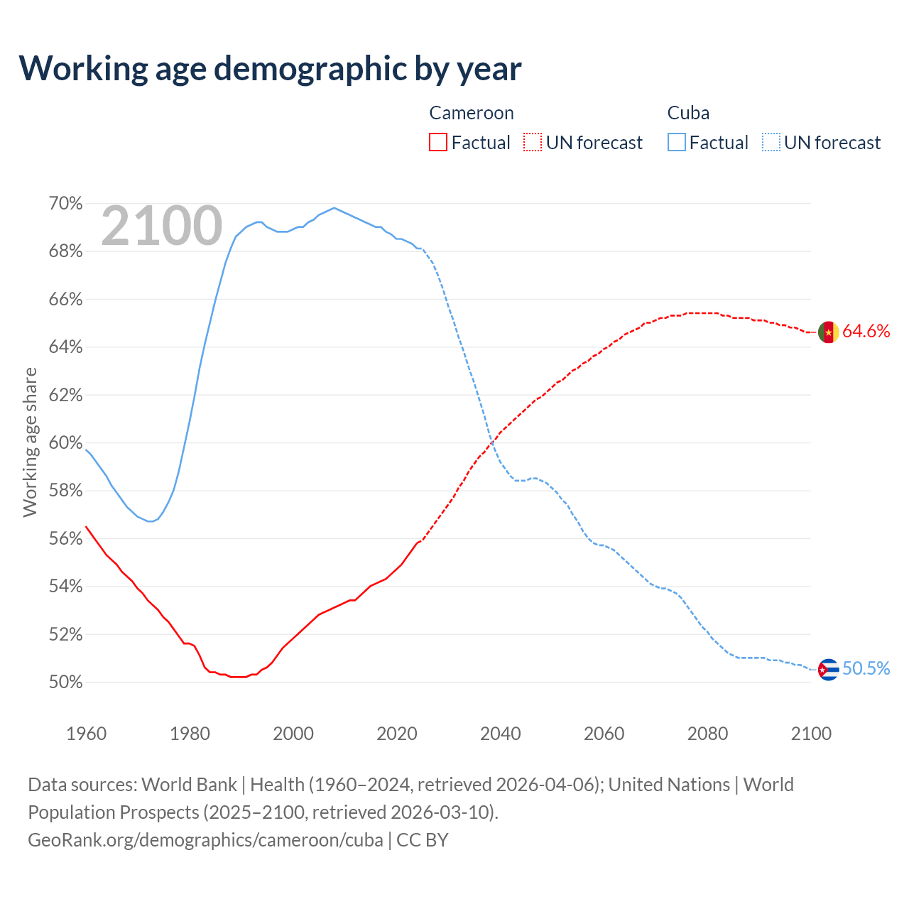 - Cameroon has 17.2M working age adults (aged 15-64) vs 7.42M in Cuba.