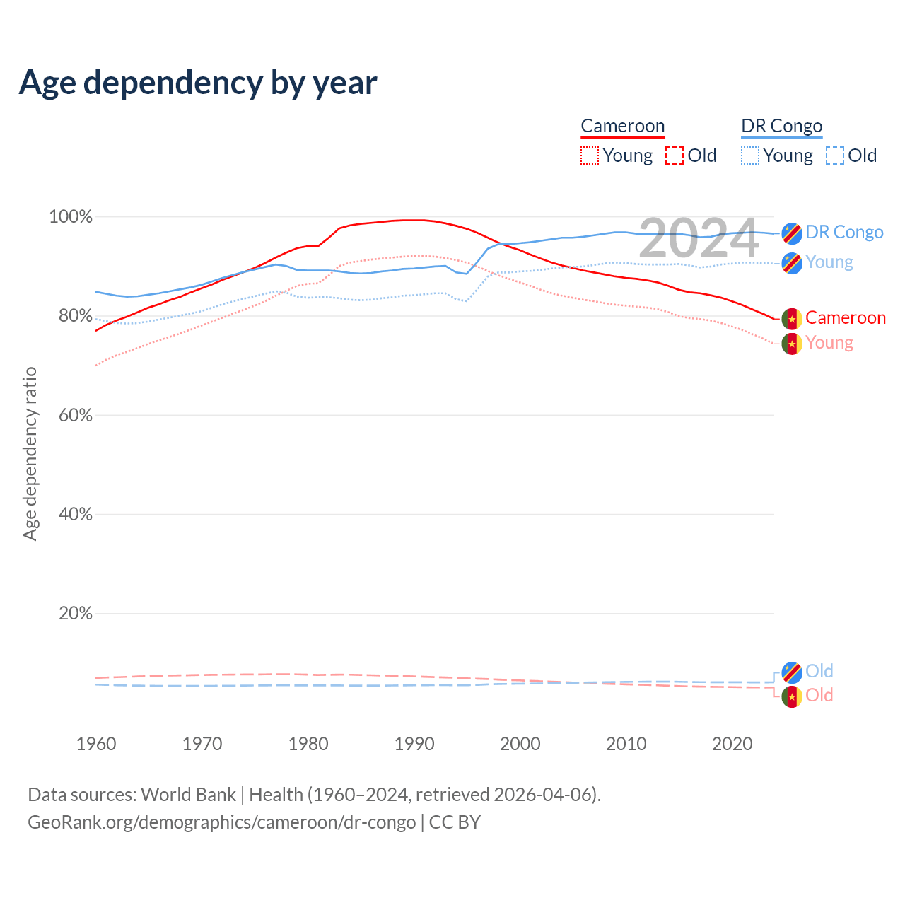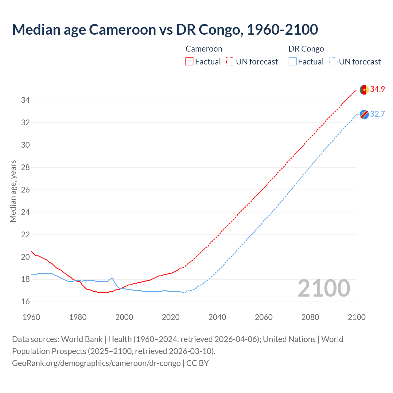 - Cameroon is ranked 180/196 by median age (oldest to youngest) vs 191/196 for the DR Congo.