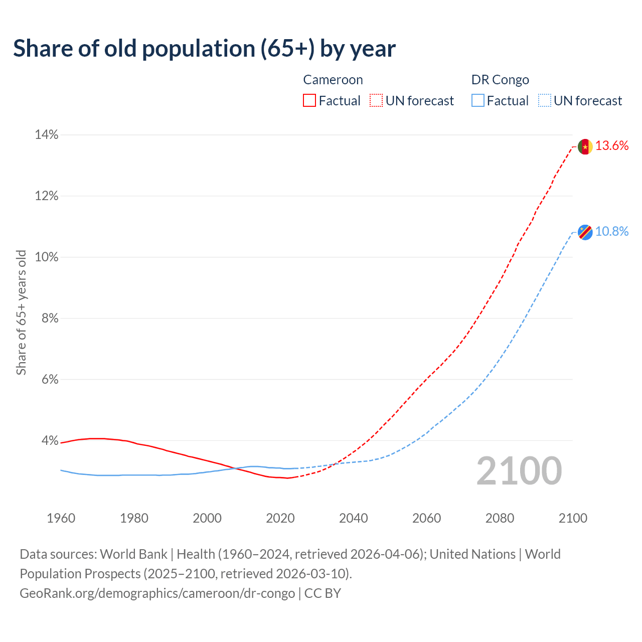 The share of older people aged 65 and over is 2.79% in Cameroon and 3.08% in the DR Congo. Life expectancy in Cameroon compared to the DR Congo .